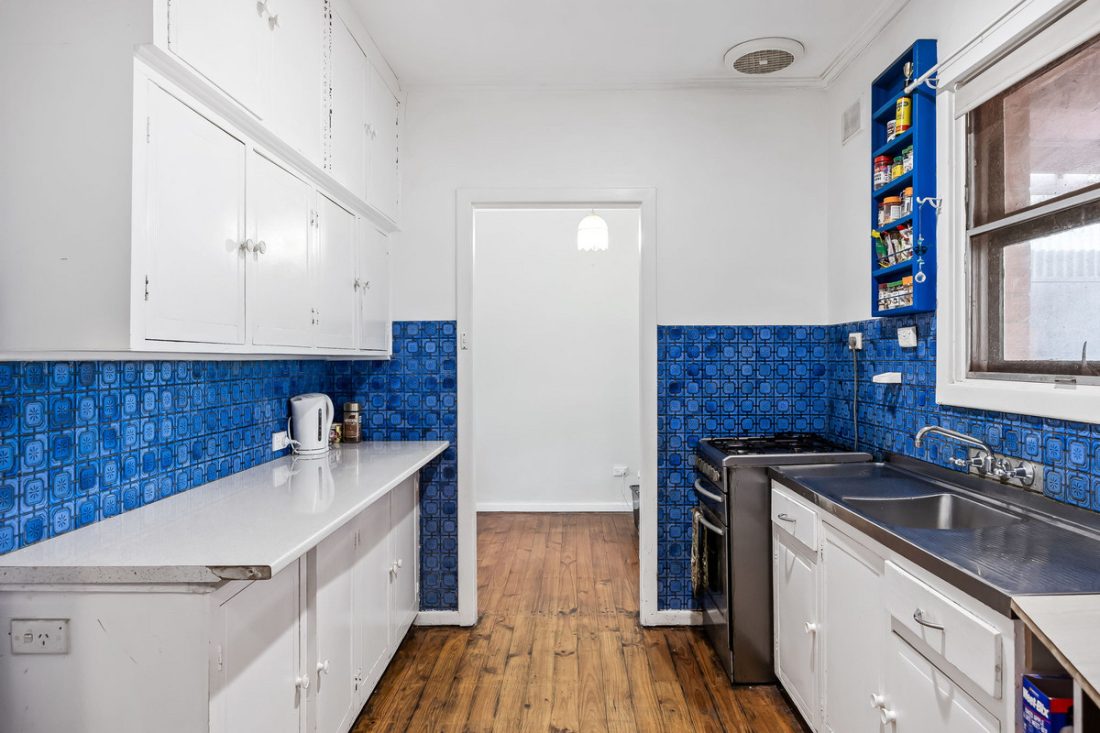 At the centre of the home, the kitchen and meals area brings together practicality and potential, featuring a gas stove, tiled splash back, and ample cabinetry. The adjoining dining space is ideal for casual meals and flows naturally into the main lounge, creating a hub for everyday living.