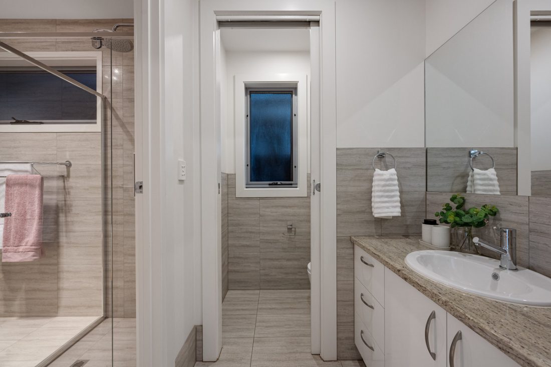 Back inside, up to four well-sized bedrooms deliver comfort and flexibility. The master suite is a private retreat with a walk-in robe, additional built-in storage, and a luxurious ensuite featuring floor-to-ceiling tiling, sleek vanity, and contemporary fittings. The remaining bedrooms are serviced by a thoughtfully designed three-part bathroom with separate bath, shower, toilet, and dedicated vanity area — perfect for busy households. A laundry with built-in cabinetry and outdoor access rounds out the practical floor plan.