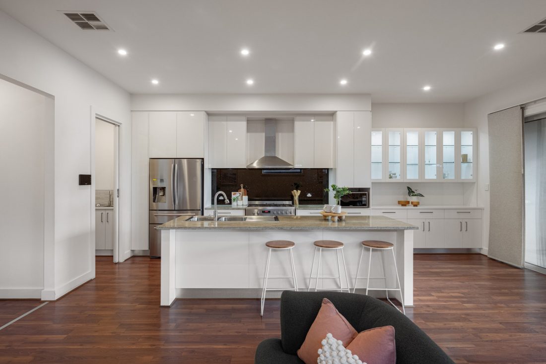 A long hallway leads you to the heart of the home – an open kitchen, dining, and living space bathed in natural light, enhanced by downlights and timber-look flooring that flows seamlessly throughout.