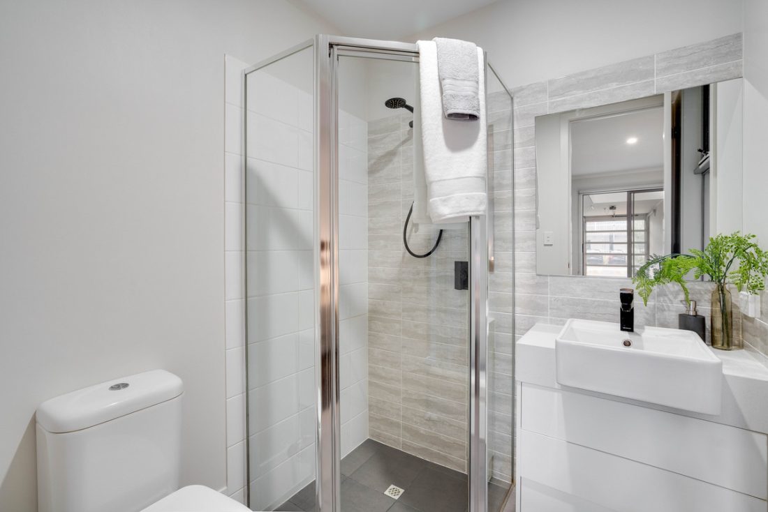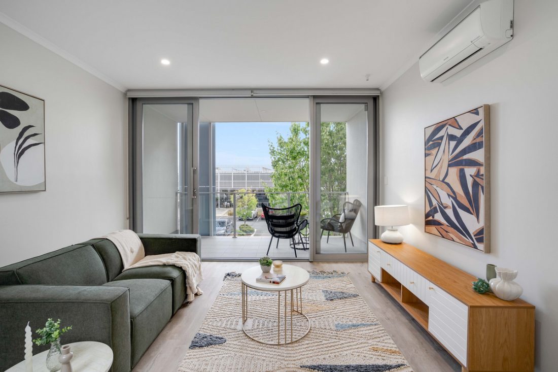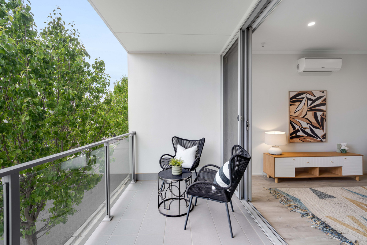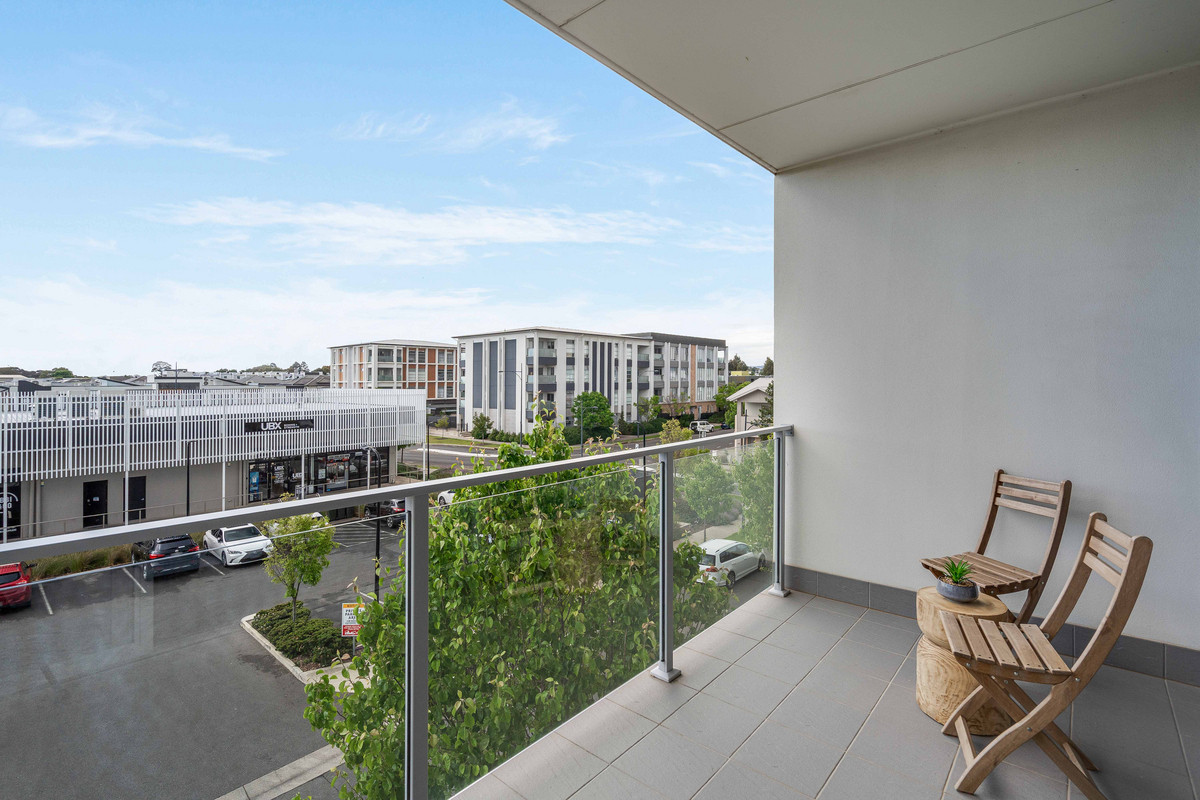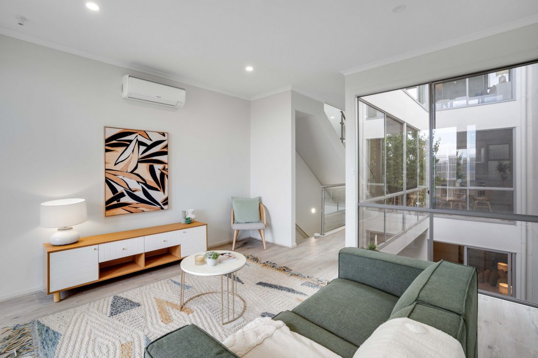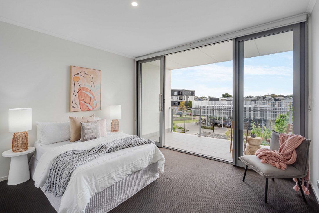 On the opposite side of the void, the main living area takes full advantage of its north-facing position, ensuring even more natural light. Glass sliding doors open to a delightful balcony with views of the lake and café—perfect for relaxing and soaking in your new Lightsview lifestyle.