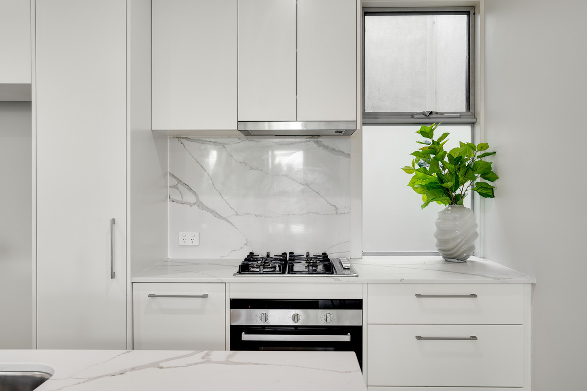 Heading upstairs, the heart of the home awaits. The open-plan kitchen, meals, and lounge area is flooded with natural light thanks to the floor to ceiling windows overlooking the void. The kitchen blends style and functionality, featuring an island bench with bar seating, stone bench-tops, sleek black tap ware, an under-mounted double sink, glass splash-back, and sleek stainless-steel appliances, including a dishwasher and gas cooktop.