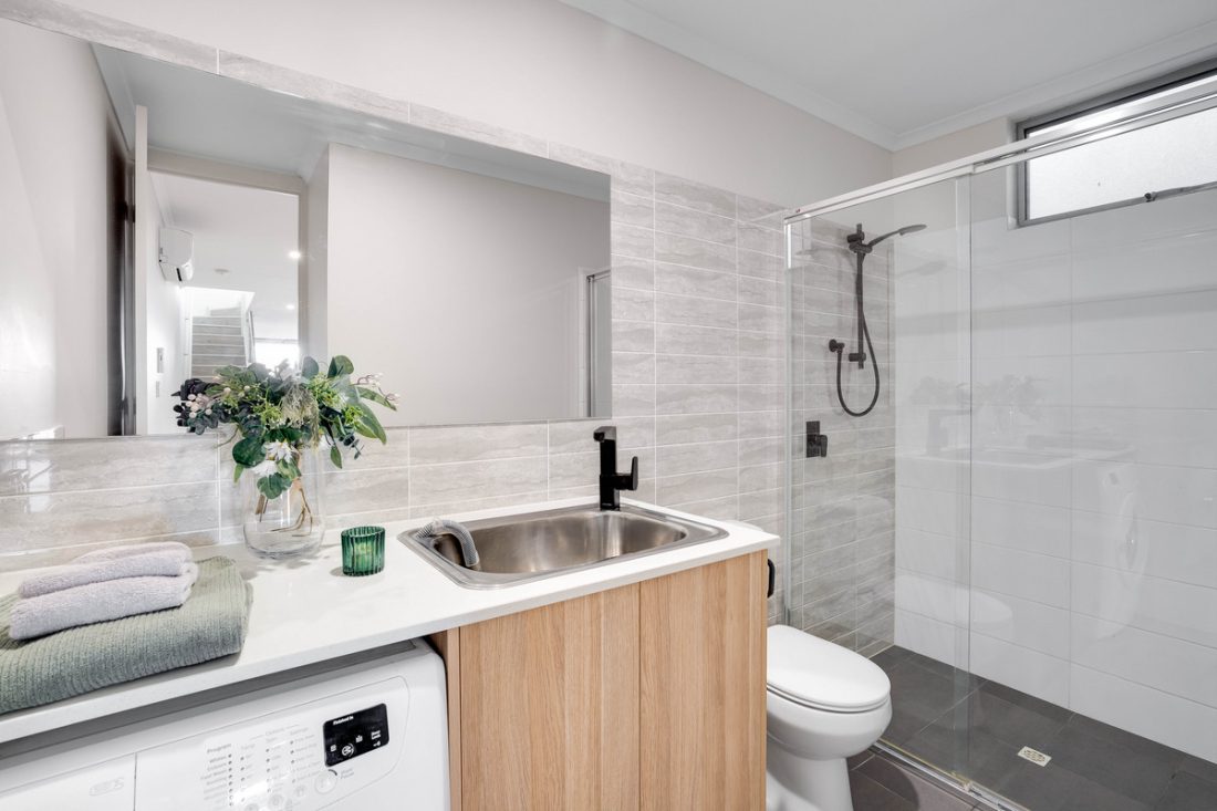 A spacious bathroom with laundry facilities completes the second level, tucked away behind the kitchen and complete with stylish wooden cabinetry, black tap ware, a shower and a toilet.