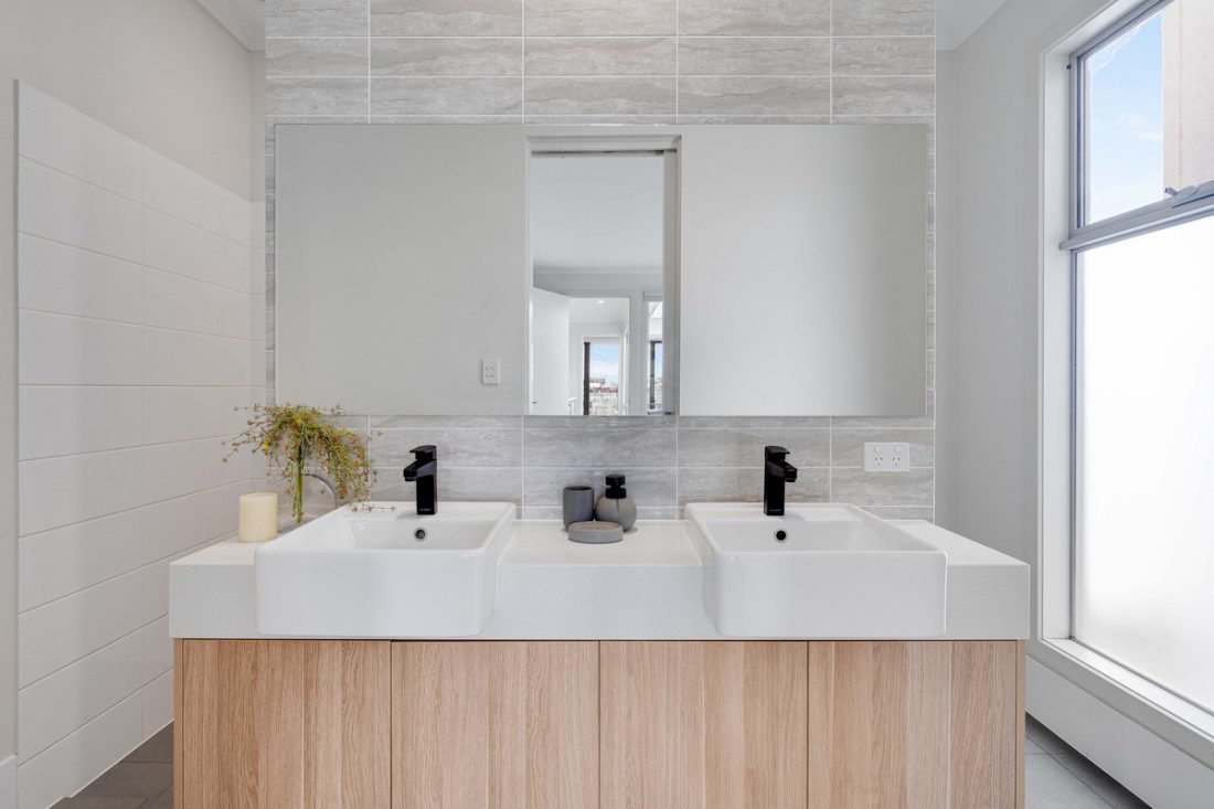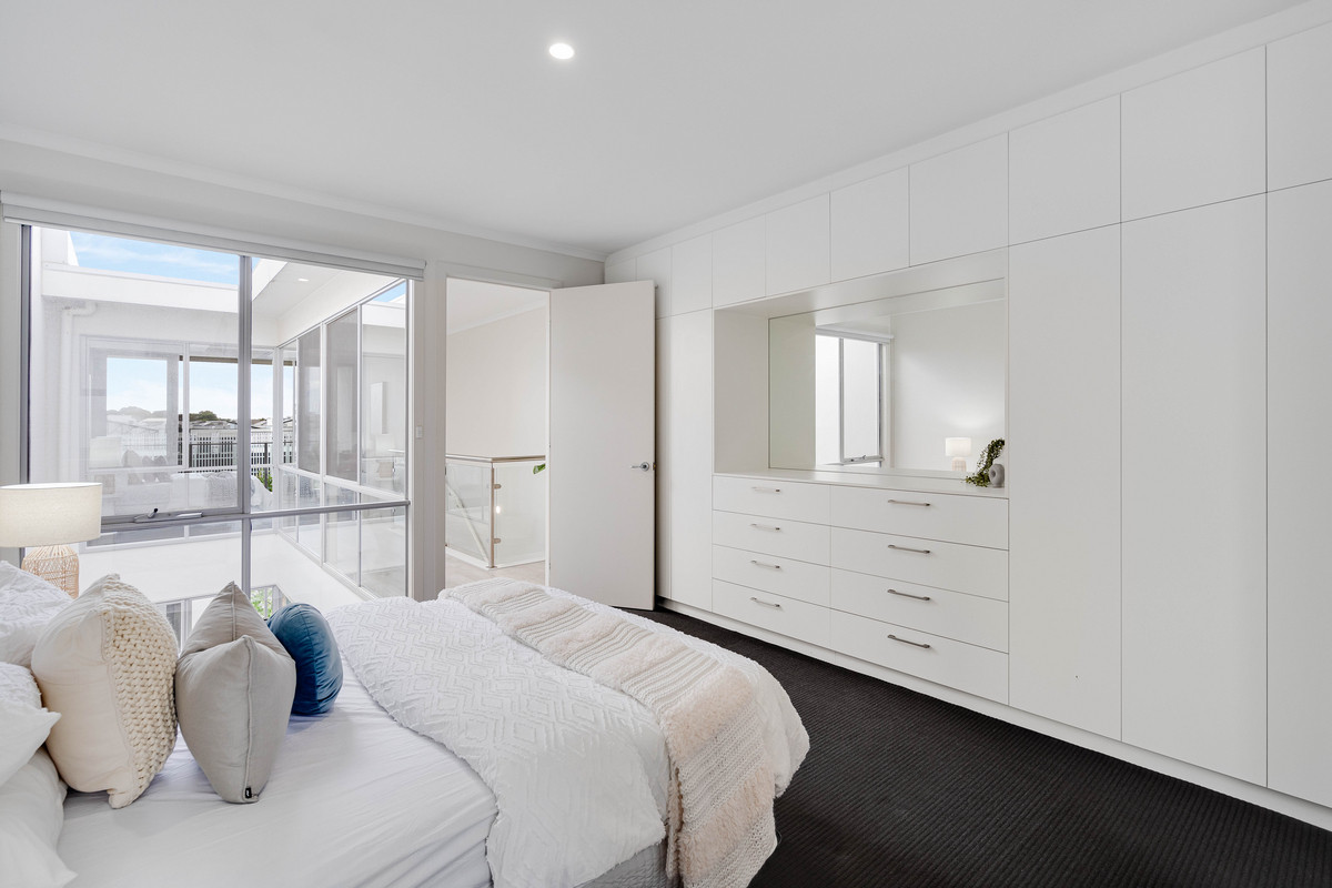 The third floor is home to the master suite, a luxurious retreat with wall-to-wall built-in storage and a spacious ensuite. The ensuite features a double vanity with wooden cabinetry and black hardware, complementing the design of the bathroom below, along with a large walk-in shower. A third bedroom, or potential second living area, completes this level, with access to a second private balcony—another outdoor spot to soak in the sunshine.