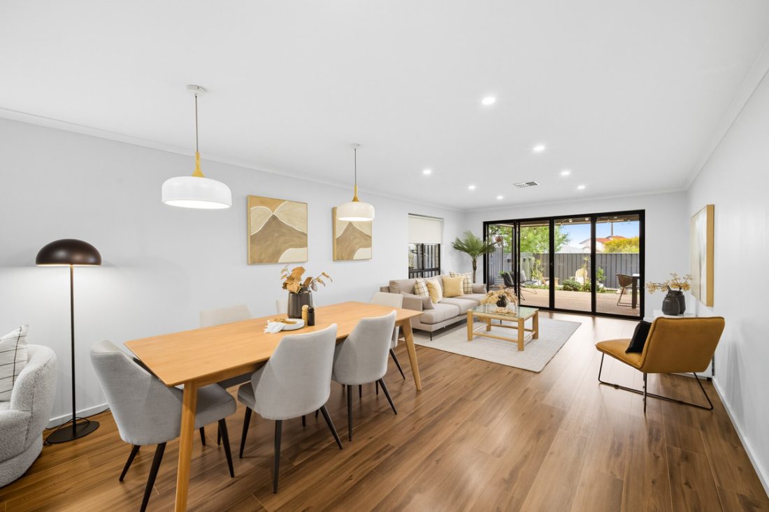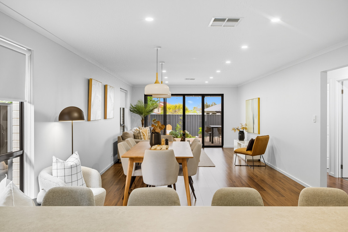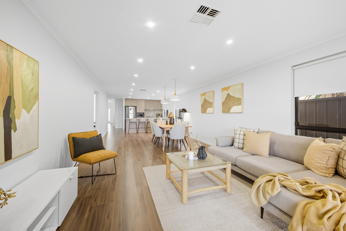 – Open-plan kitchen, dining, and living with timber-look flooring