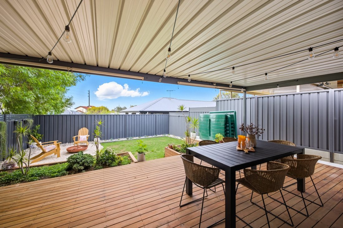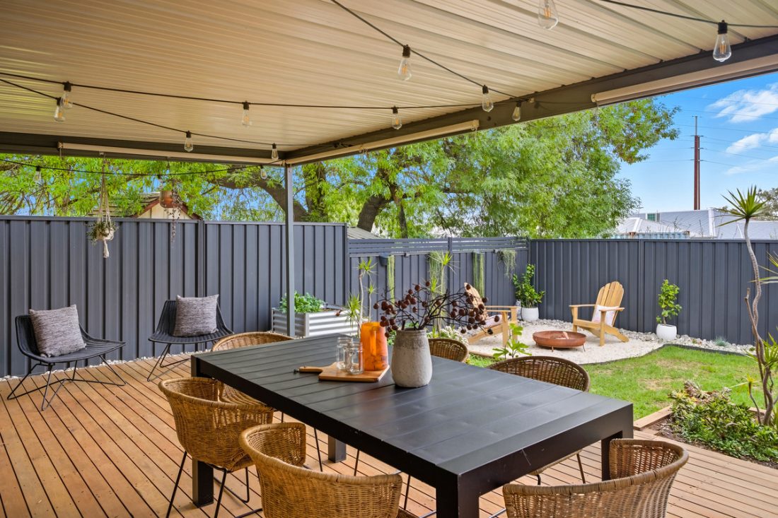 On entry, you’re welcomed by a light-filled secondary living space at the front of the home—perfect as a lounge, media room, or quiet retreat—before the layout guides you to the main hub at the rear. Here, a stylish kitchen blends sleek cabinetry with stainless steel appliances, gas cooktop, dishwasher, and downlighting, flowing seamlessly into open-plan living. Timber-look floors carry warmth throughout, while sliding glass doors extend the space to a wooden deck overlooking lush lawn, established garden beds, and a cosy fire pit corner—ideal for relaxed evenings or lively gatherings.