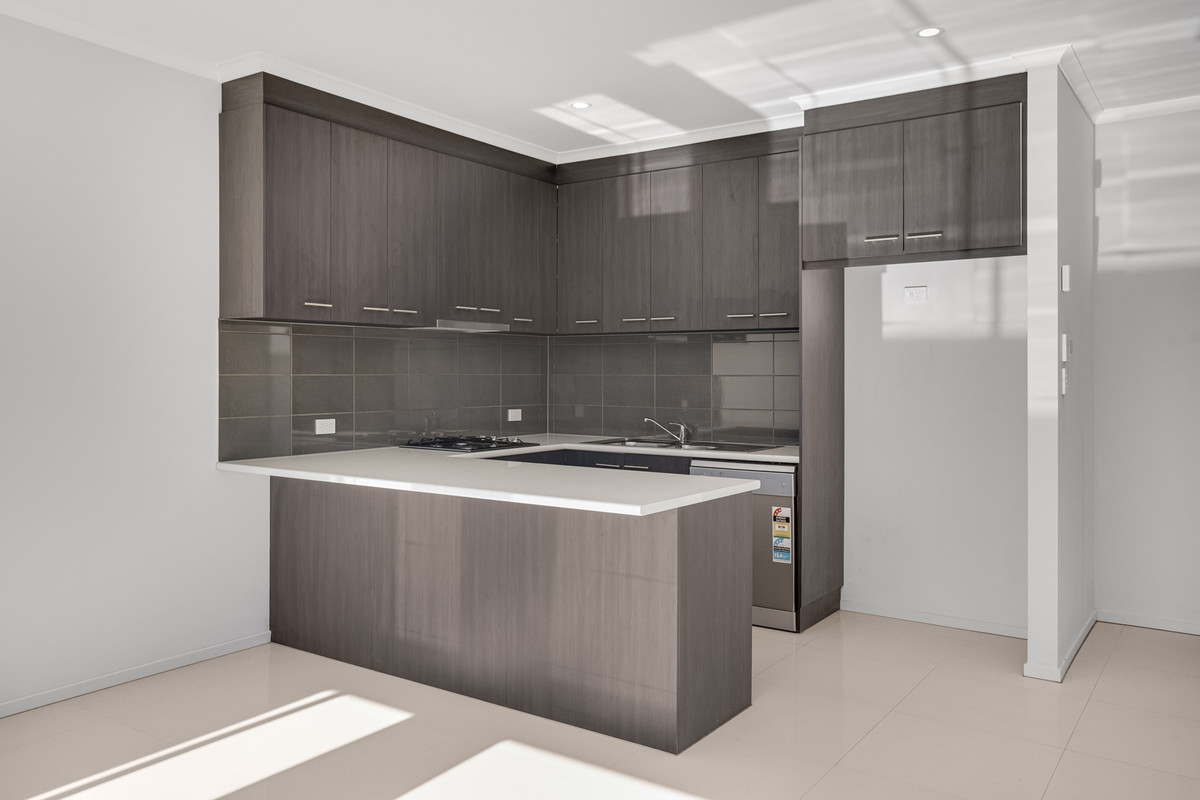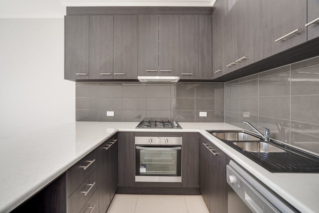The heart of the home opens into a spacious living and kitchen area, creating a central hub for daily life. The modern kitchen is a chef’s delight, featuring a gas cooktop, stainless-steel appliances, a tiled splashback, and ample storage space for all your culinary needs.
