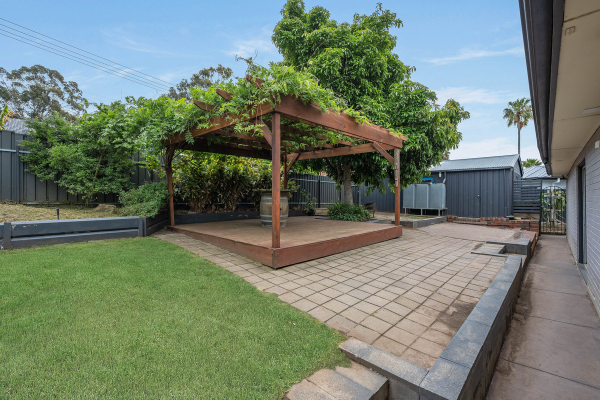 – Pergola/deck, lush lawn, established gardens, garden shed and clothesline