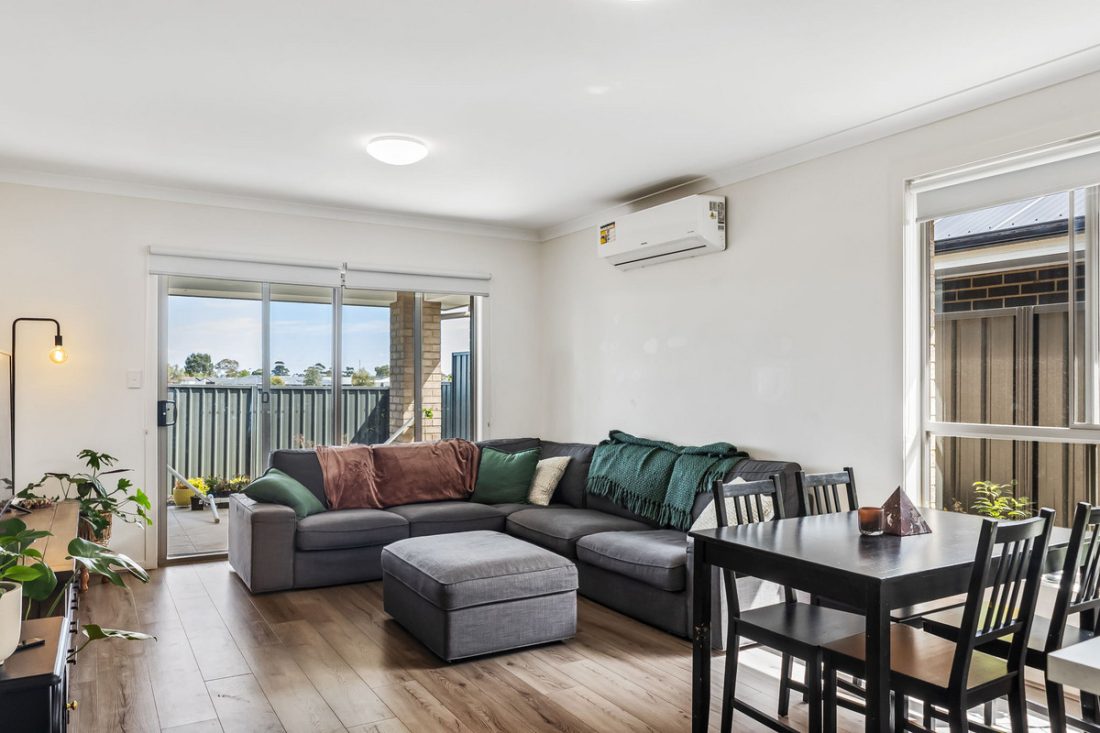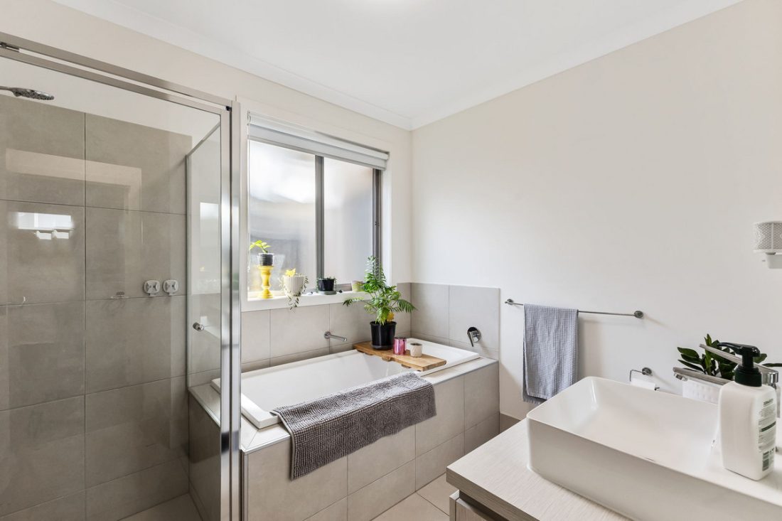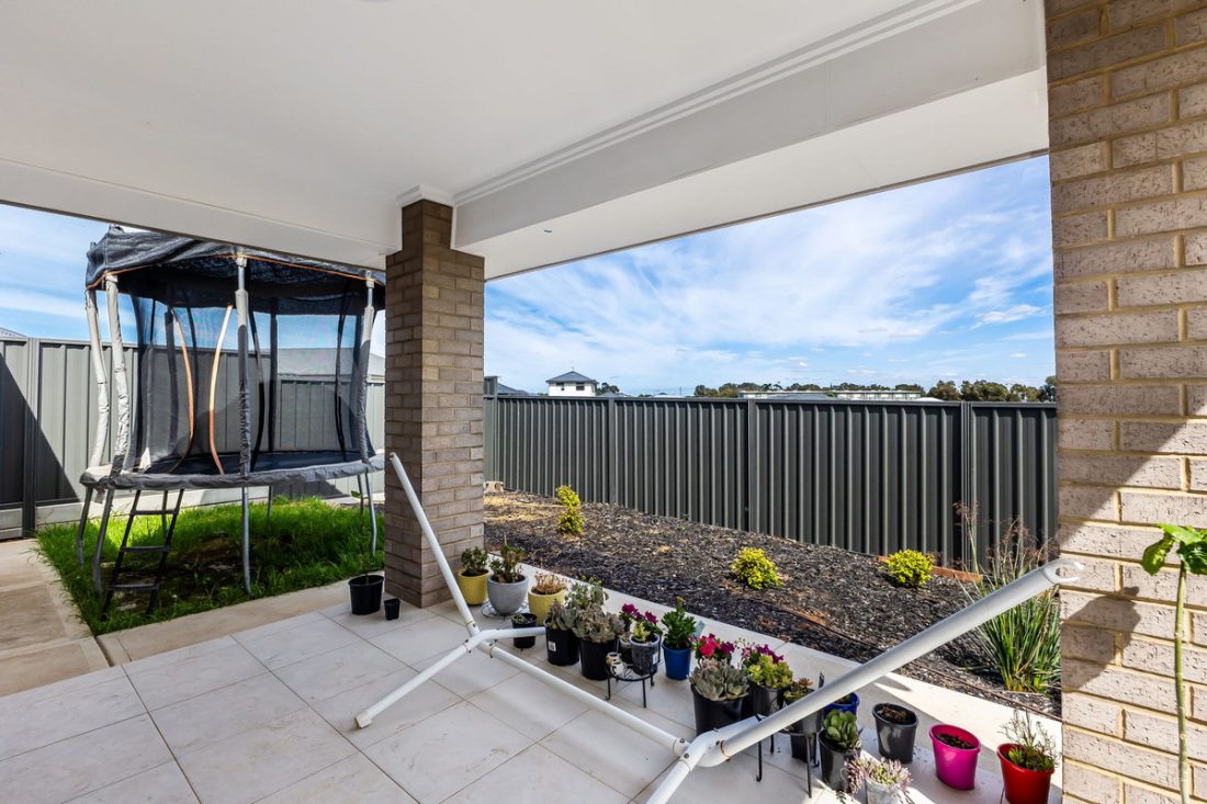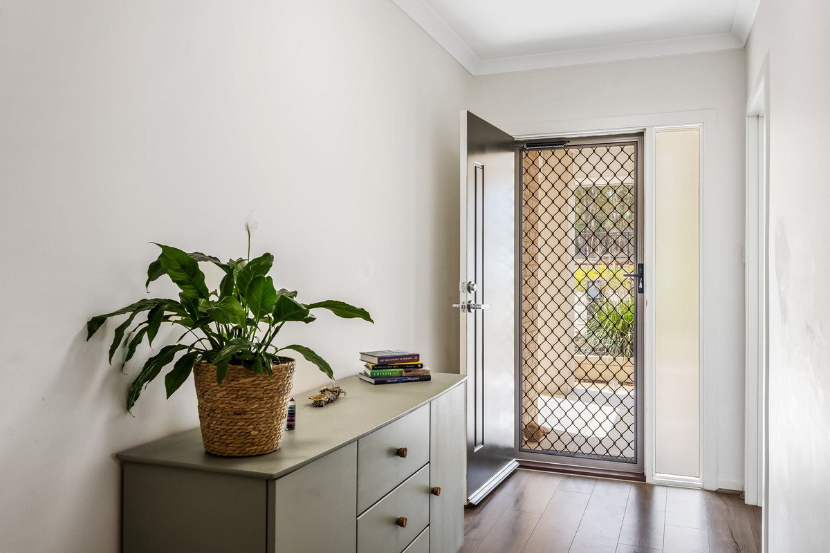 The adjoining dining and living areas are bathed in natural light, creating a bright and airy atmosphere. Glass sliding doors open to the outdoor space, seamlessly blending indoor and outdoor living. The well-sized yard, complete with an undercover alfresco area, overlooks a low-maintenance yard, the perfect space for relaxing outdoors.