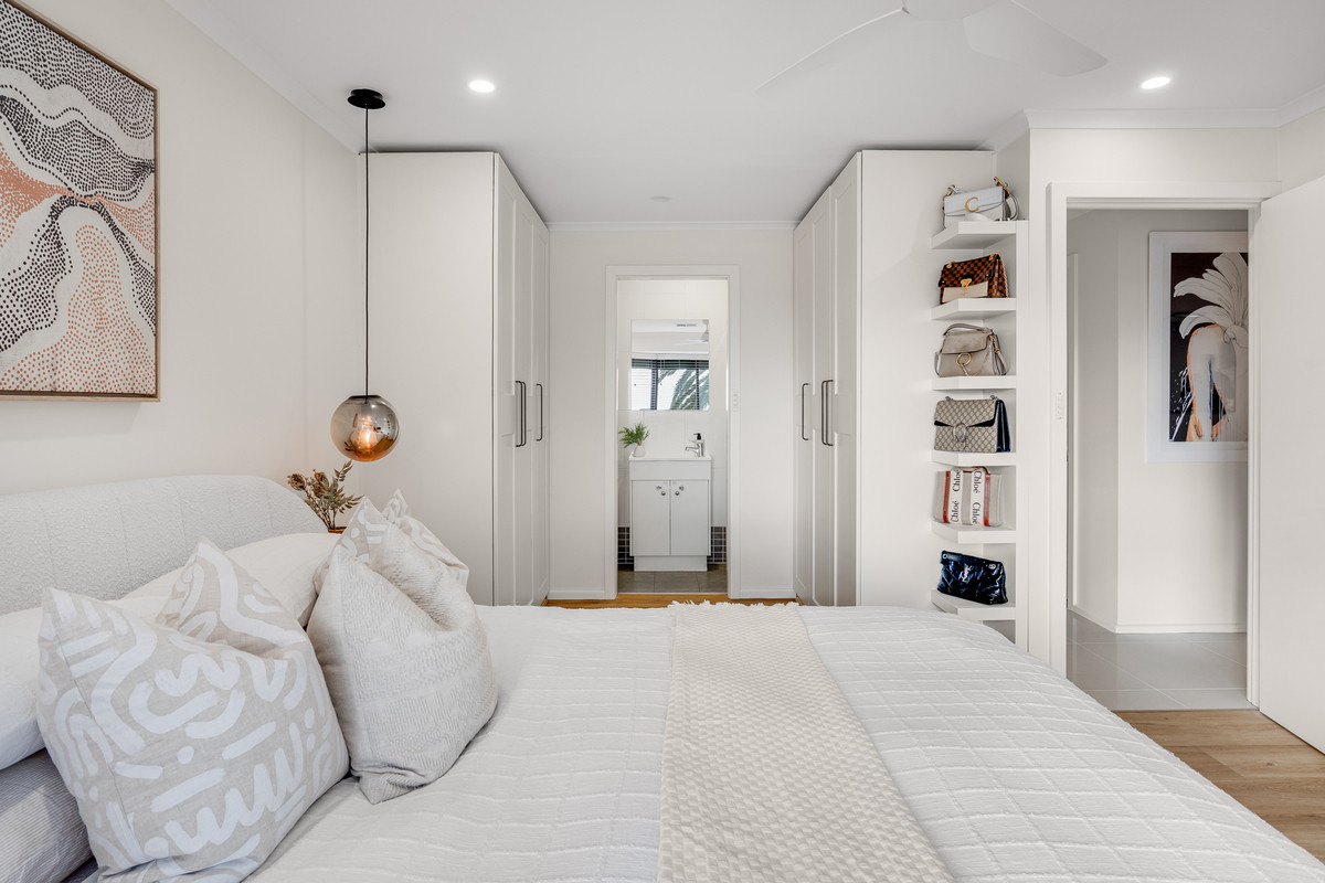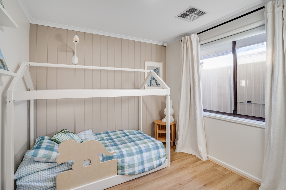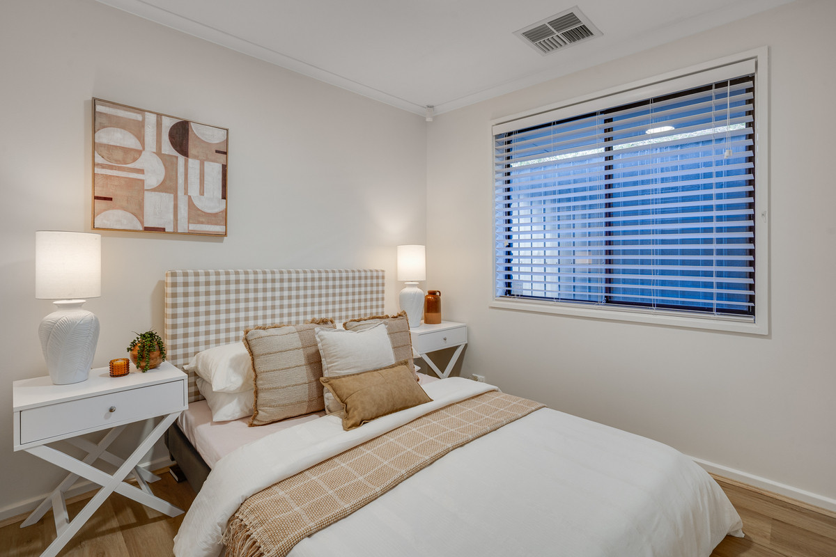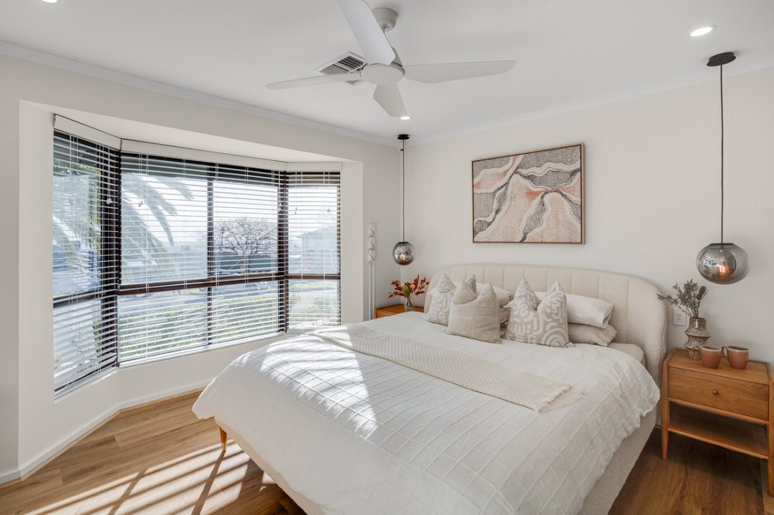 The master suite is a true retreat, boasting a bay window that bathes the room in soft light. Complete with a ceiling fan, walk-in robe, and a private ensuite, this sanctuary is designed for restful nights and serene mornings. Two additional bedrooms continue the theme of comfort and space, offering floating floors, wide windows, and ample room for the entire family.