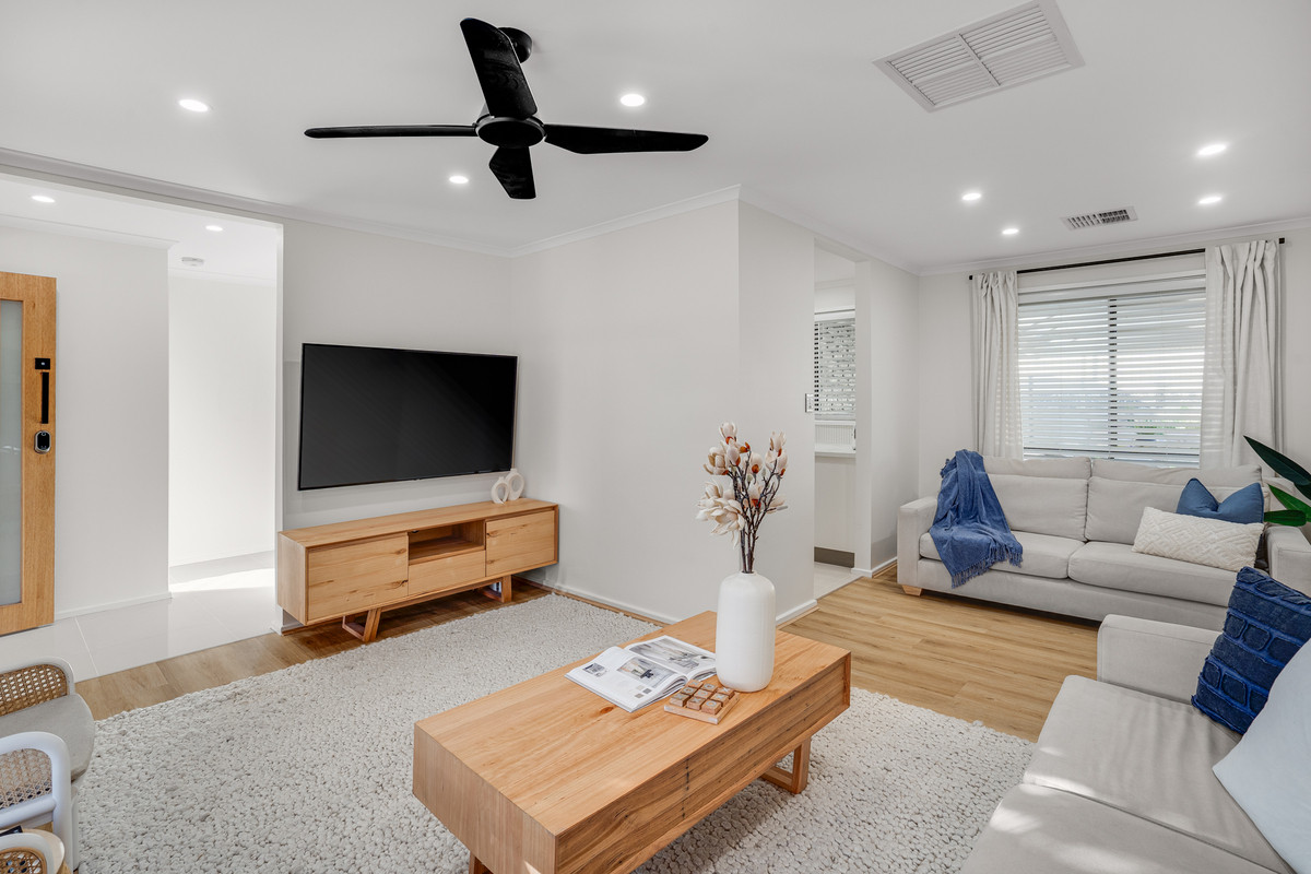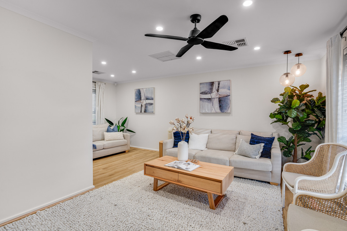 The front main living area is a sanctuary of comfort, adorned with timber-look floating floors, a black ceiling fan, and an abundance of natural light that invigorates the space.