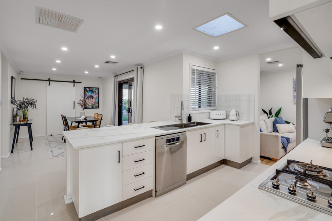 – Kitchen with pencil tile splash-back, fresh bench tops & skylight