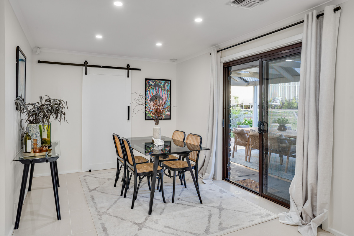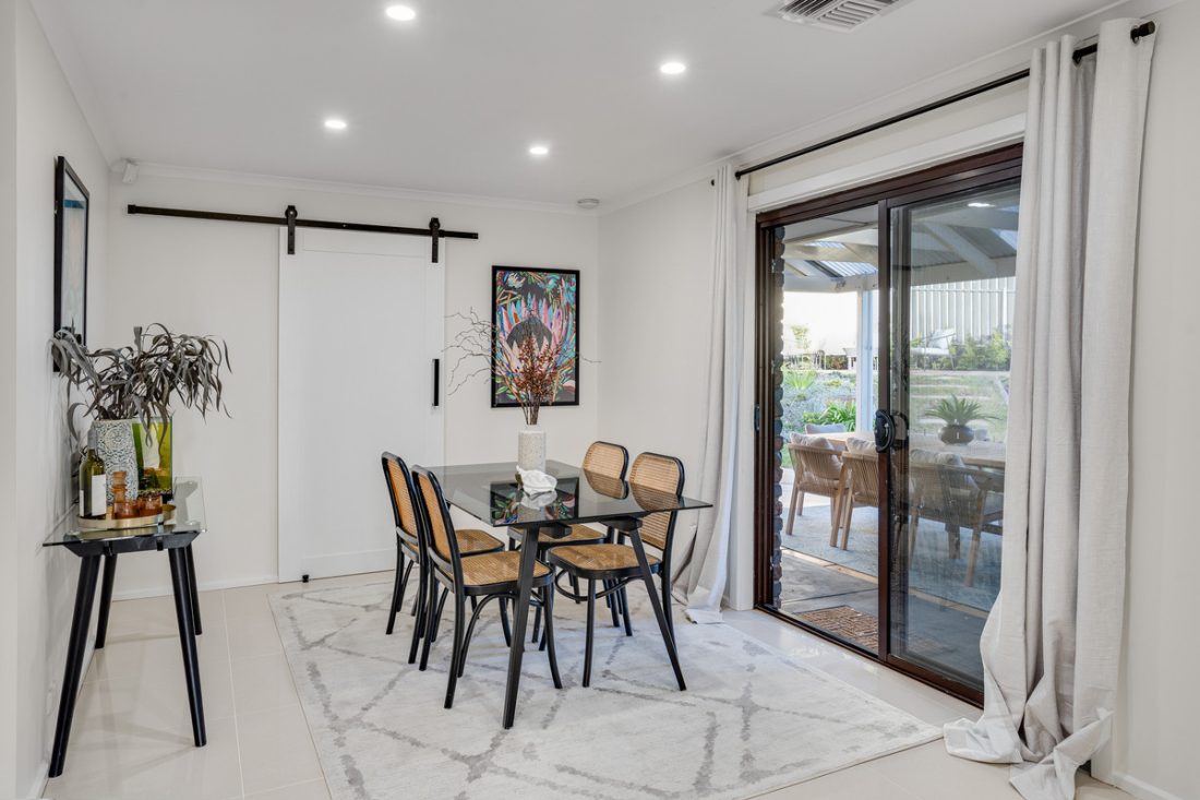 The heart of the home revolves around the central kitchen and meals area, seamlessly united by the continuation of elegant white tiling. A stylish barn door adds a touch of character, while easy outdoor access beckons you to enjoy the serenity of the surrounding landscape. The kitchen has been expertly renovated, featuring a white pencil tiled splash-back, fresh bench-tops, a skylight and a convenient gas cooktop, making it a haven for culinary enthusiasts.