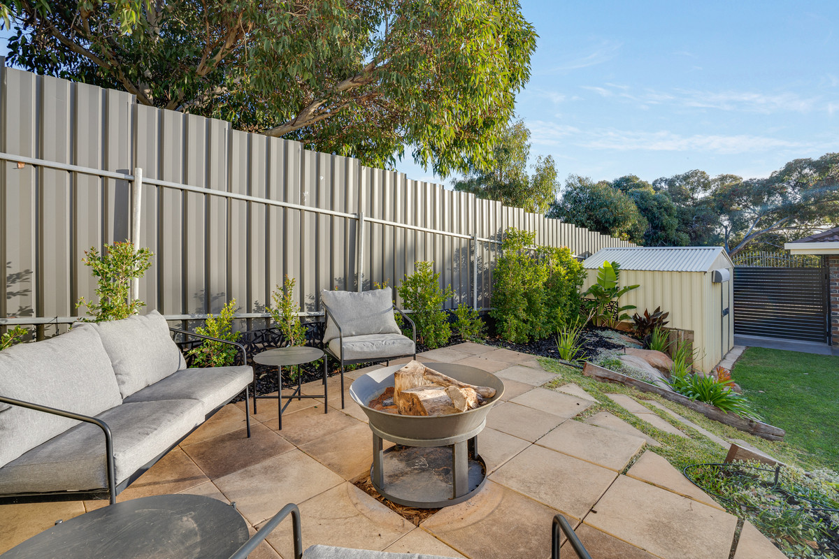 The backyard unveils an elevated fire pit area, destined to be the favored spot for cherished family moments. Ample grassed area caters to an active family lifestyle, while two garden/tool sheds and a full irrigation system cater to the avid gardener’s needs.