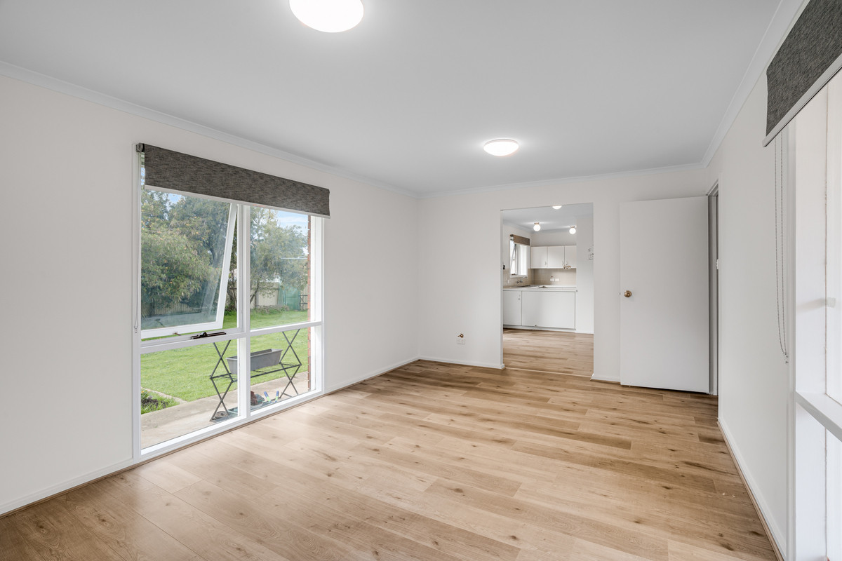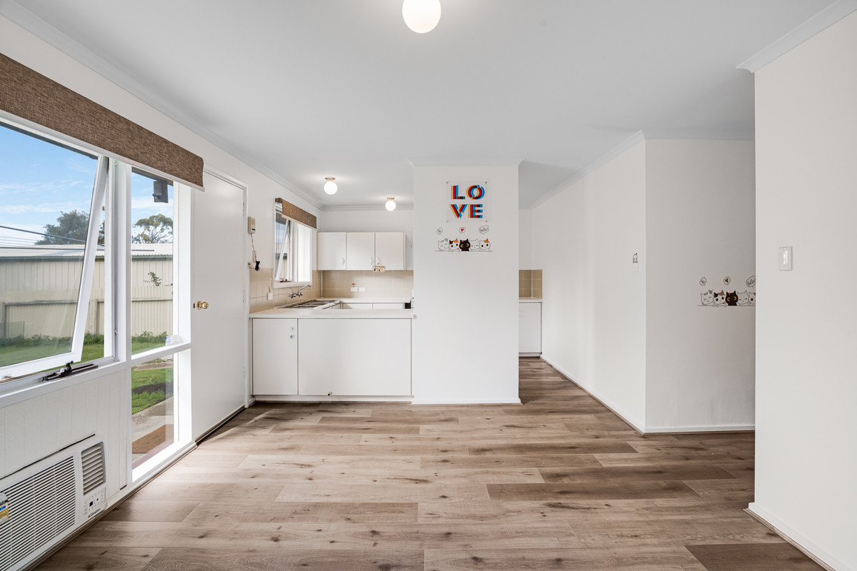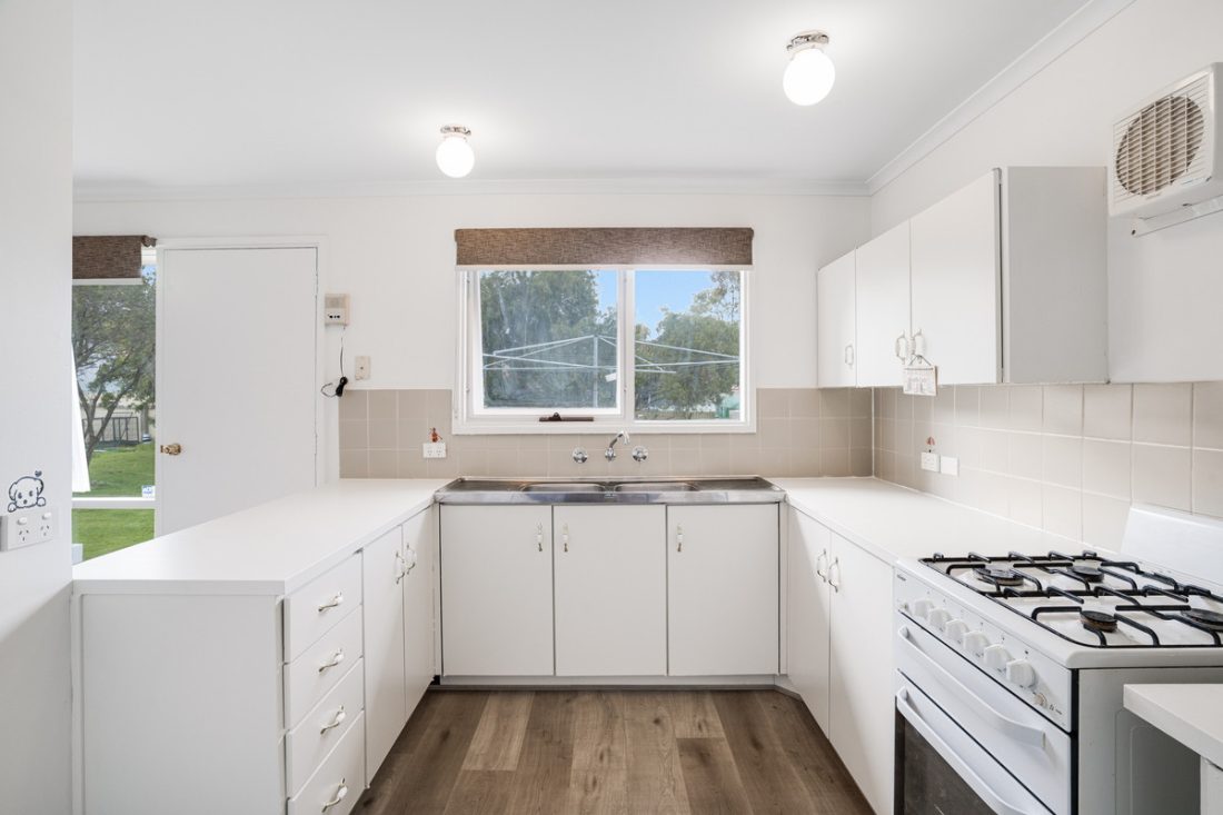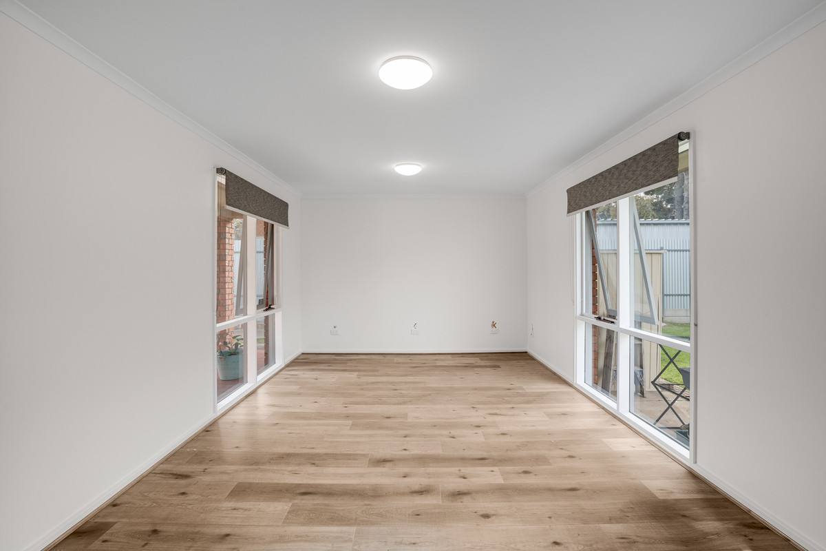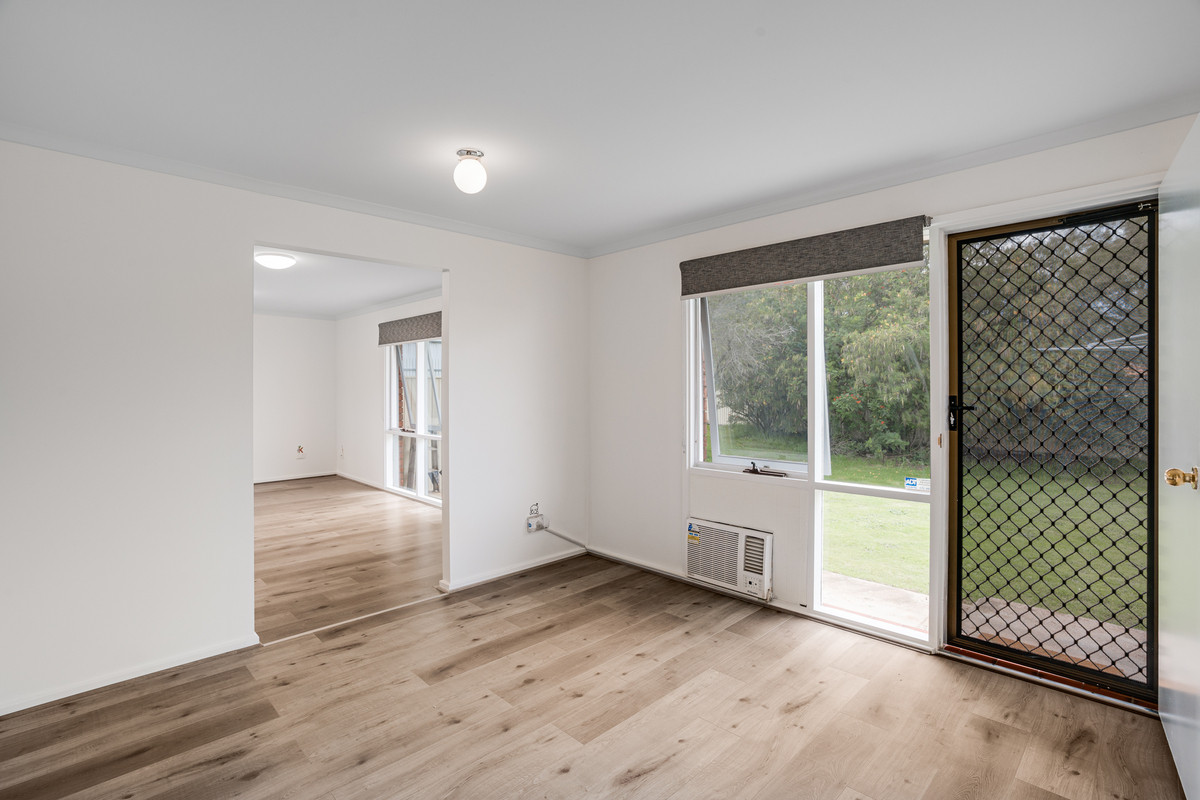 The large central kitchen is a highlight of the property, featuring ample bench space, a gas cooktop, and a tiled splash-back. It offers a perfect setting for culinary enthusiasts to whip up delightful meals for family and friends. Adjacent to the kitchen is a separate dining and lounge room, further adorned with the oak-look floating floors and bathed in natural light, creating an inviting space for hosting extended family events. For added comfort, this area includes a split system air conditioning unit.