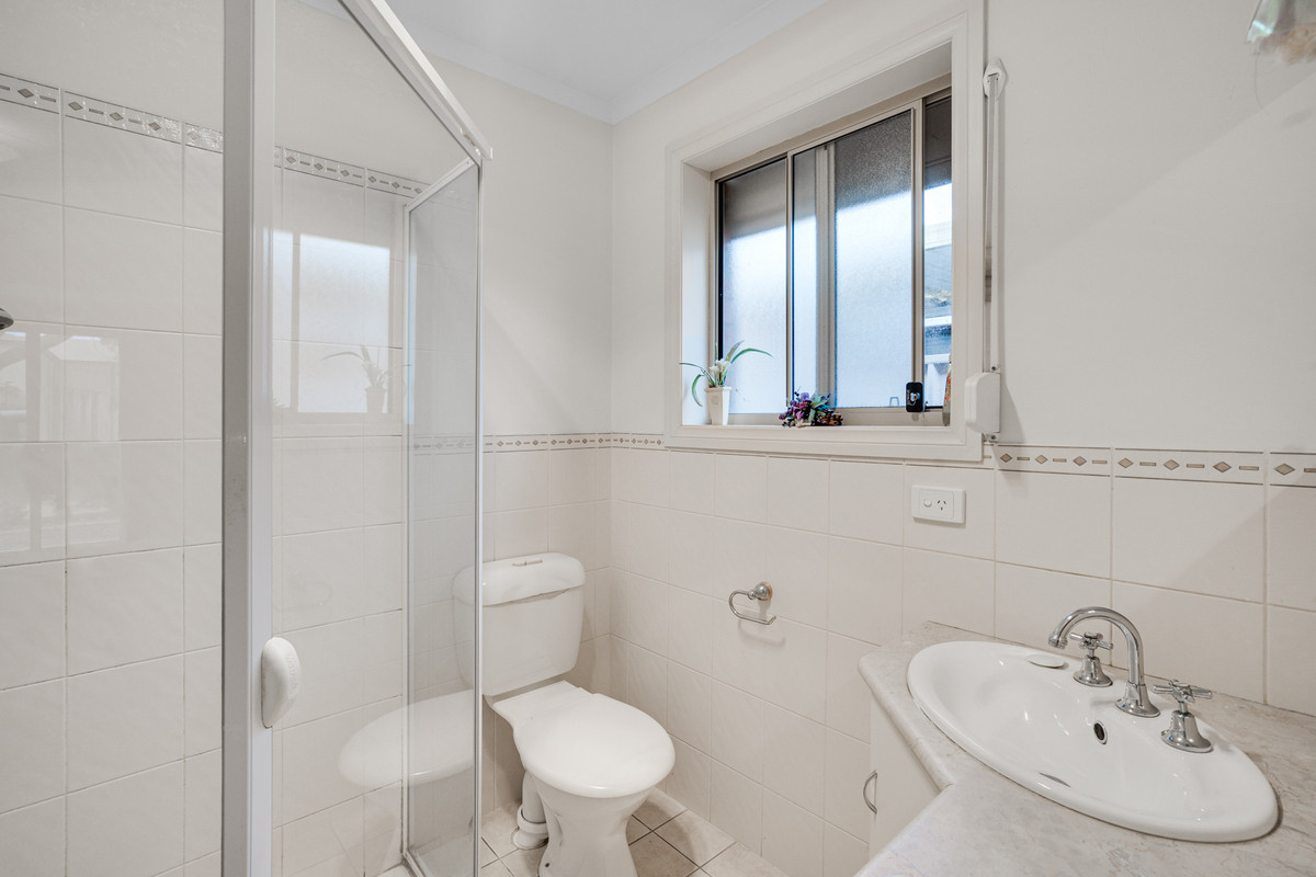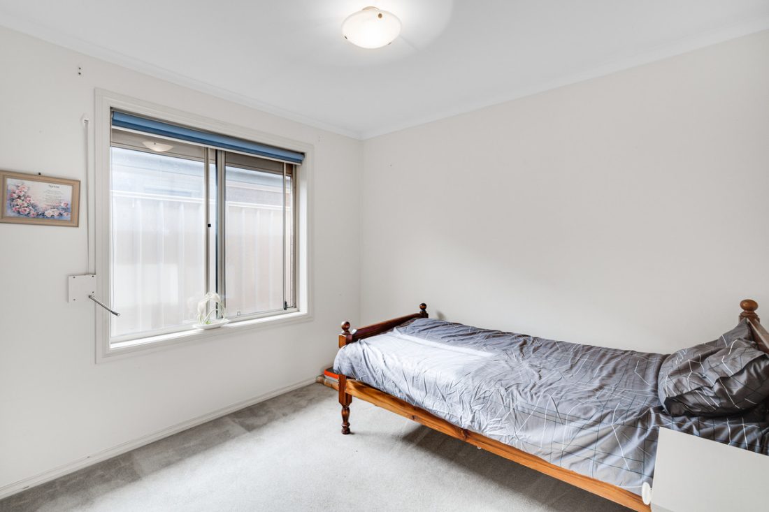 The home features three bedrooms, including a generous master suite. The master suite offers plush carpeting, a walk-in robe, a private ensuite, and a beautiful feature bay window that fills the room with natural light. The additional two bedrooms are equally well-appointed, featuring plush carpeting, built-in robes, and wide windows that allow for plenty of natural light.