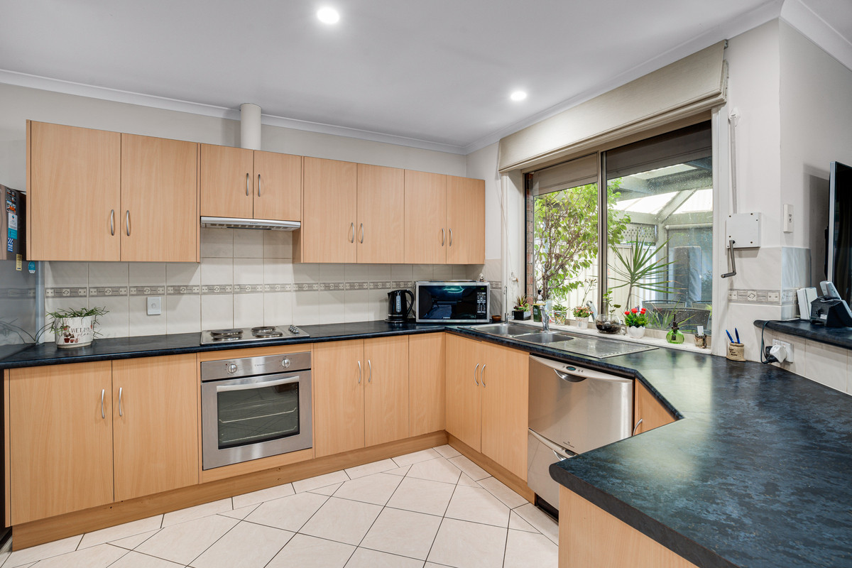 The stylish, centralized kitchen is a focal point of the property, featuring a breakfast bar, gas cooktop, stainless-steel appliances, and a convenient walk-in pantry. It is the perfect space for culinary enthusiasts and those who love to entertain.