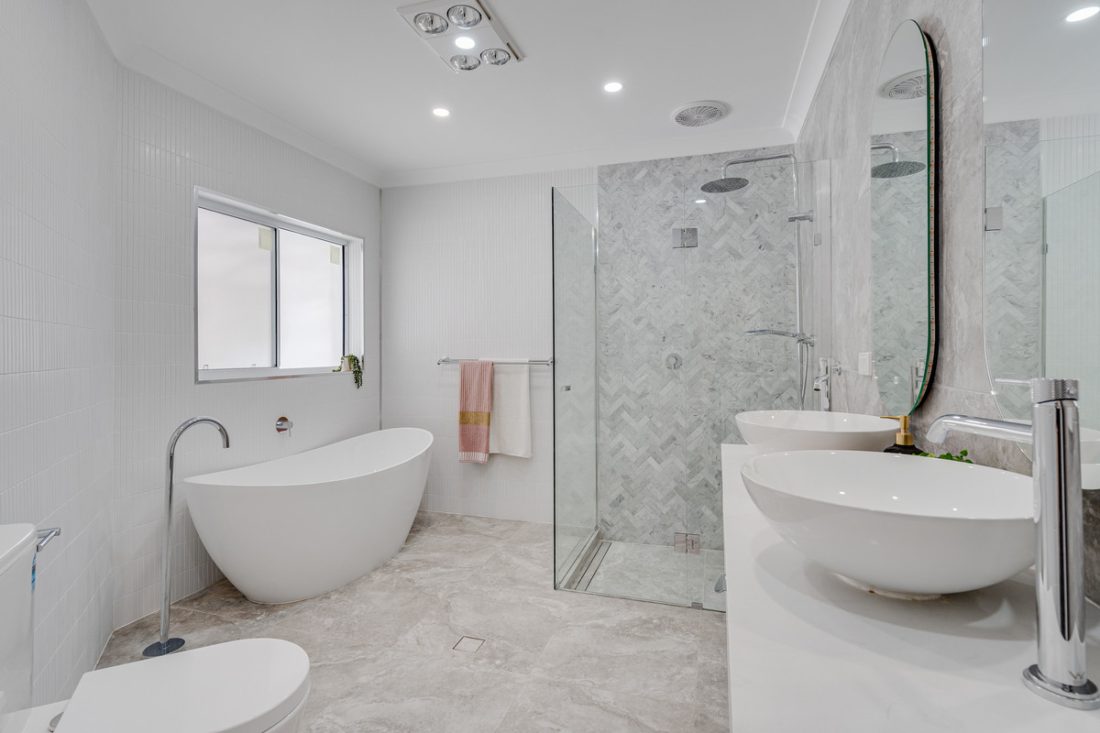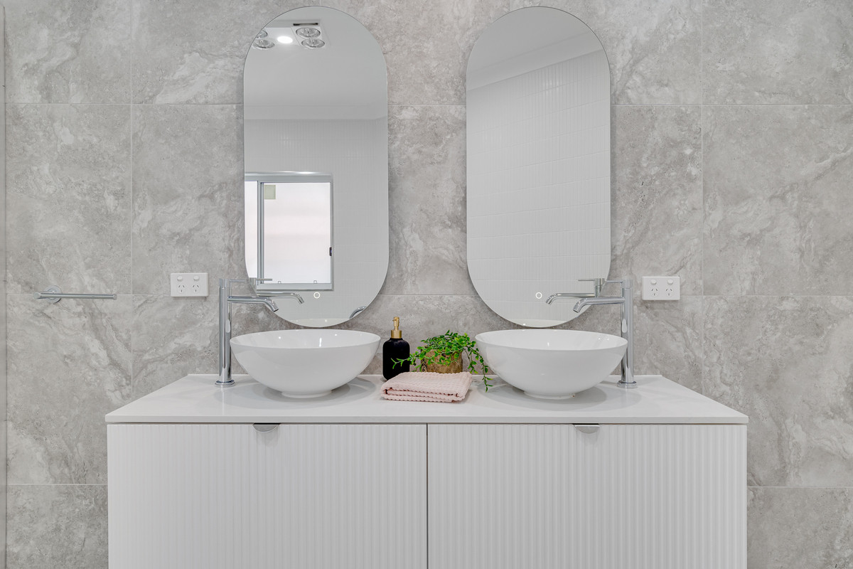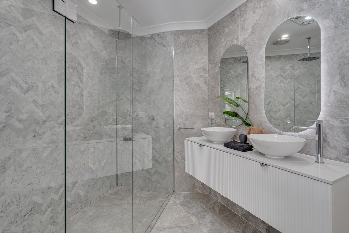 -Two luxury bathrooms with floor-to-ceiling tiles and double vanities