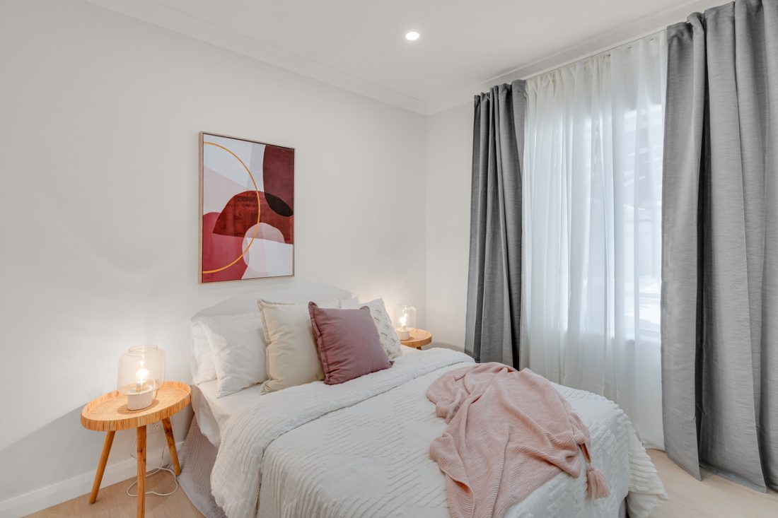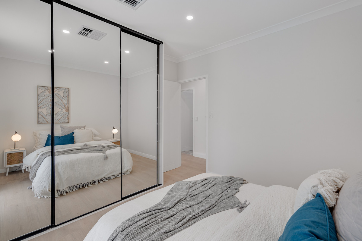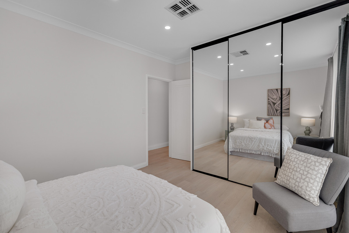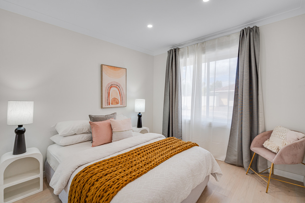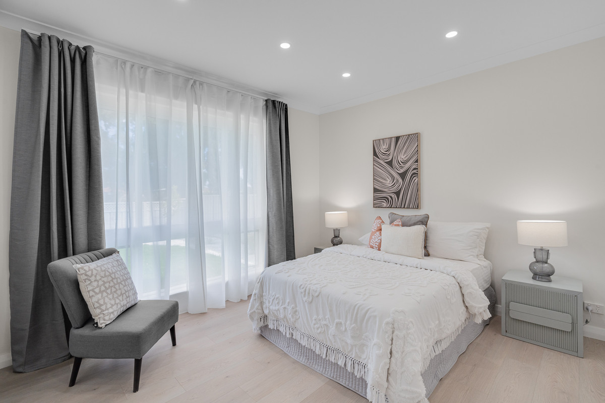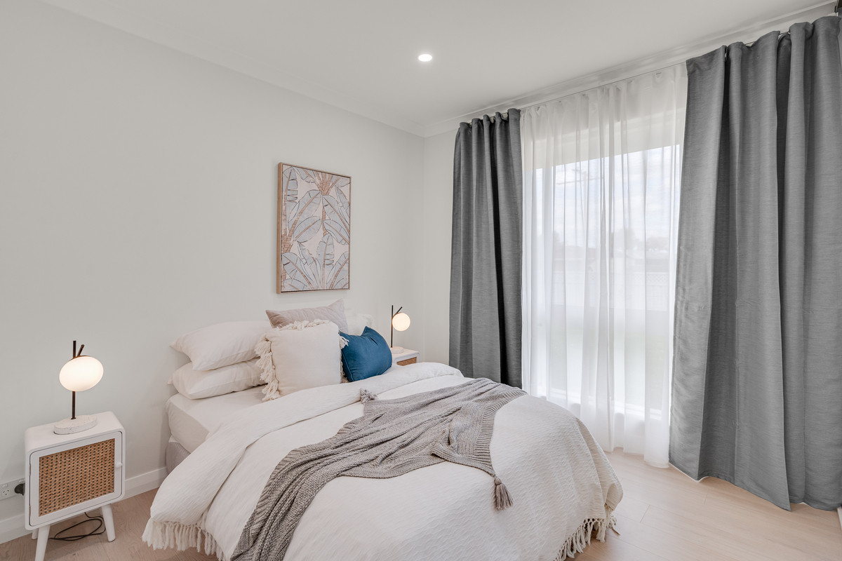 -Four spacious bedrooms, each with large windows, sheer curtains, and built-in robes with mirrored doors