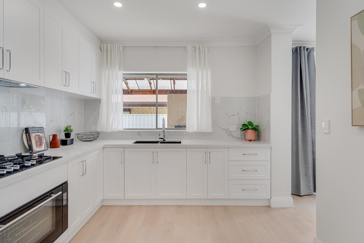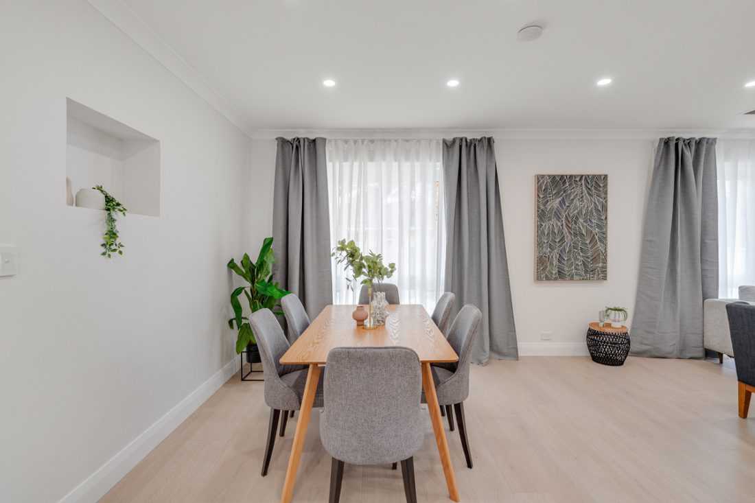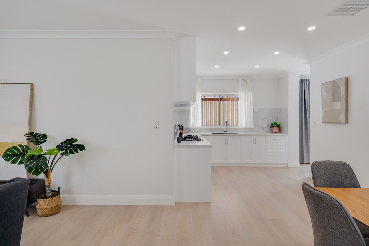 A spacious entryway sets the tone for the open plan living, dining, and kitchen area, featuring wide windows that flood the space with abundant natural light. The light timber flooring throughout adds to the light and airy ambience, making you feel at home form the get go.