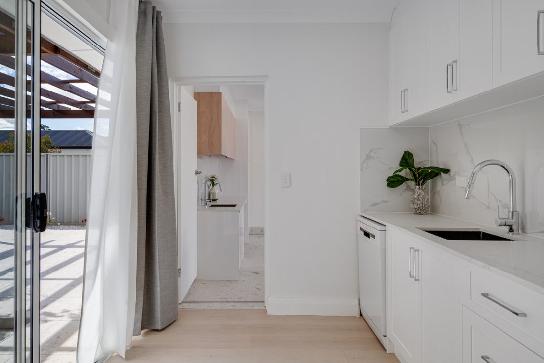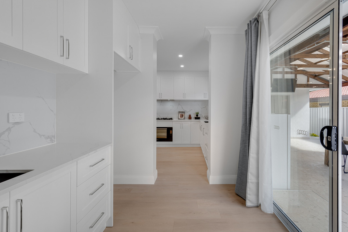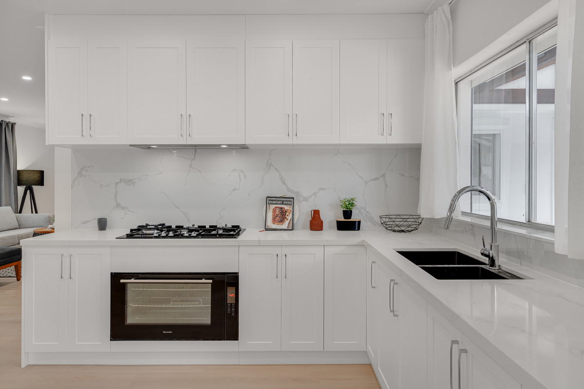 -Kitchen features stone bench tops, splashback, shaker doors, and a 5-burner gas cooktop, plus a butler’s pantry with additional sink, dishwasher, and fridge provision