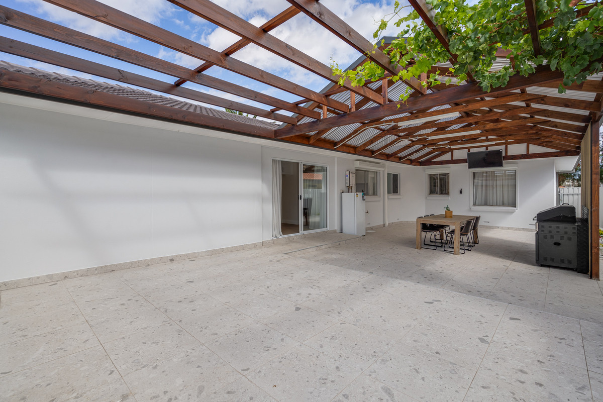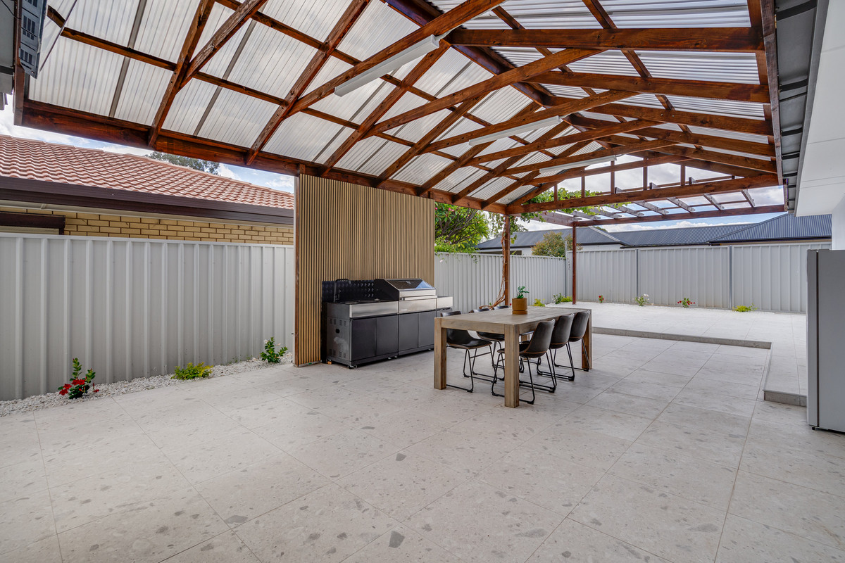 Entertain all year round under the gabled pergola, which features a trendy terrazzo tiled floor, a TV, and a Matador kitchen/BBQ area. Vines adorn the pergola, creating a delightful sunlit atmosphere during the warmer months, perfect for outdoor gatherings and relaxation.