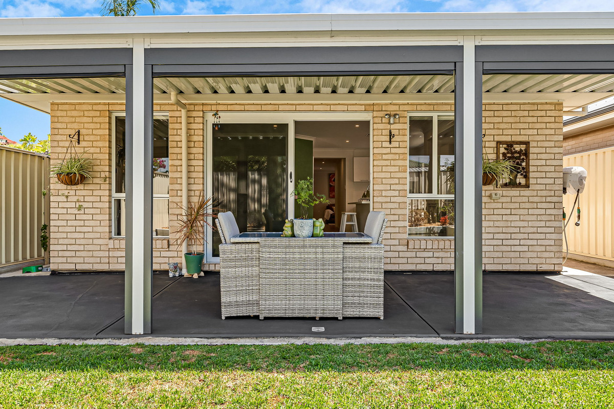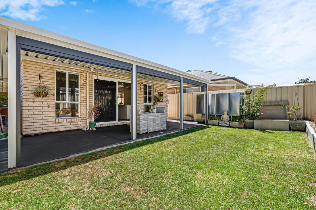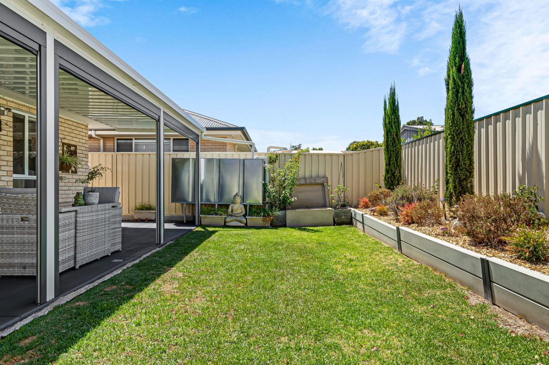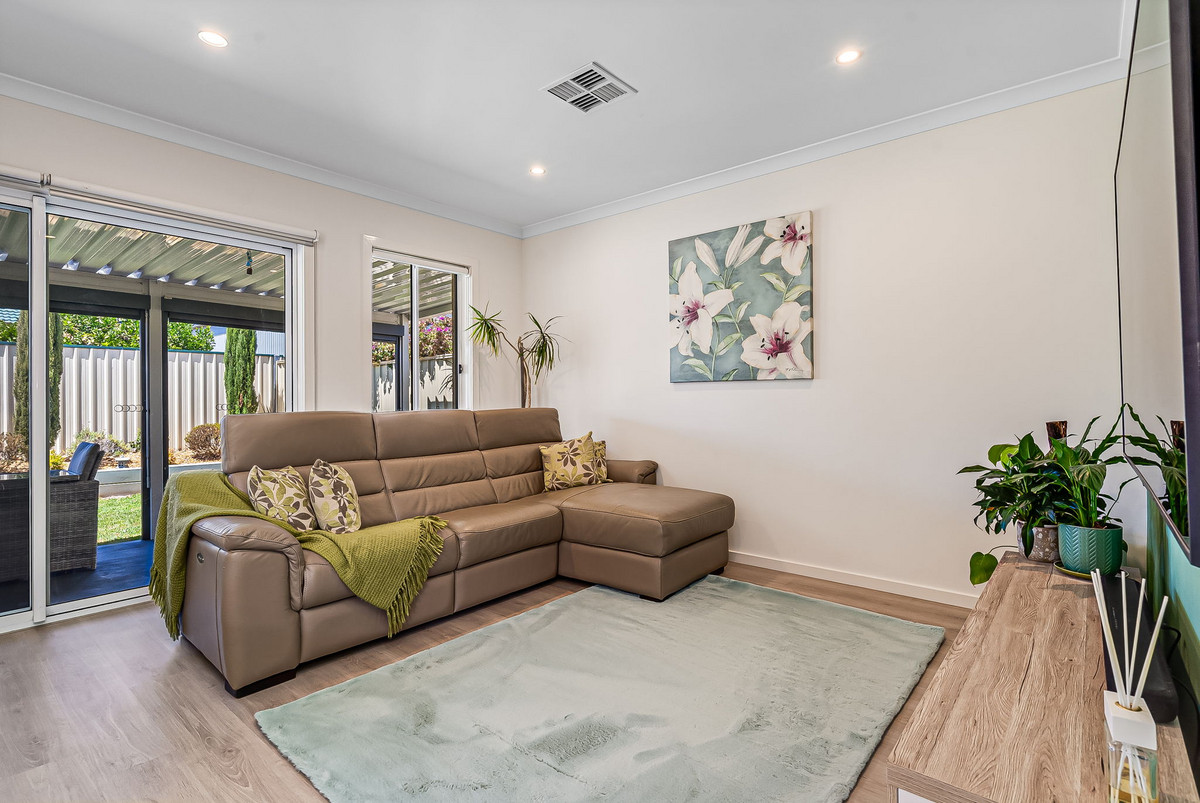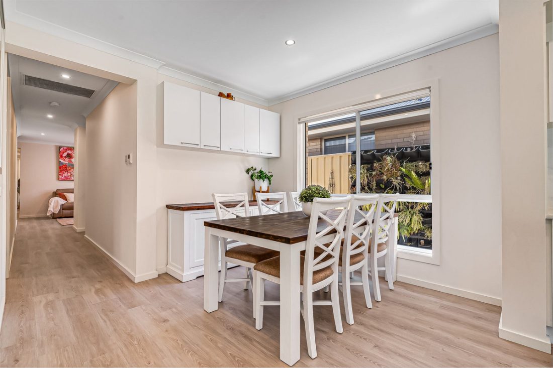 Seamlessly connected, the dining and living areas flow effortlessly to the backyard through glass sliding doors. Outside, a private retreat awaits, featuring an undercover alfresco area with outdoor blinds, overlooking a neatly manicured lawn and a tidy garden bed along the fence line – perfect for kids to play and pets to roam.