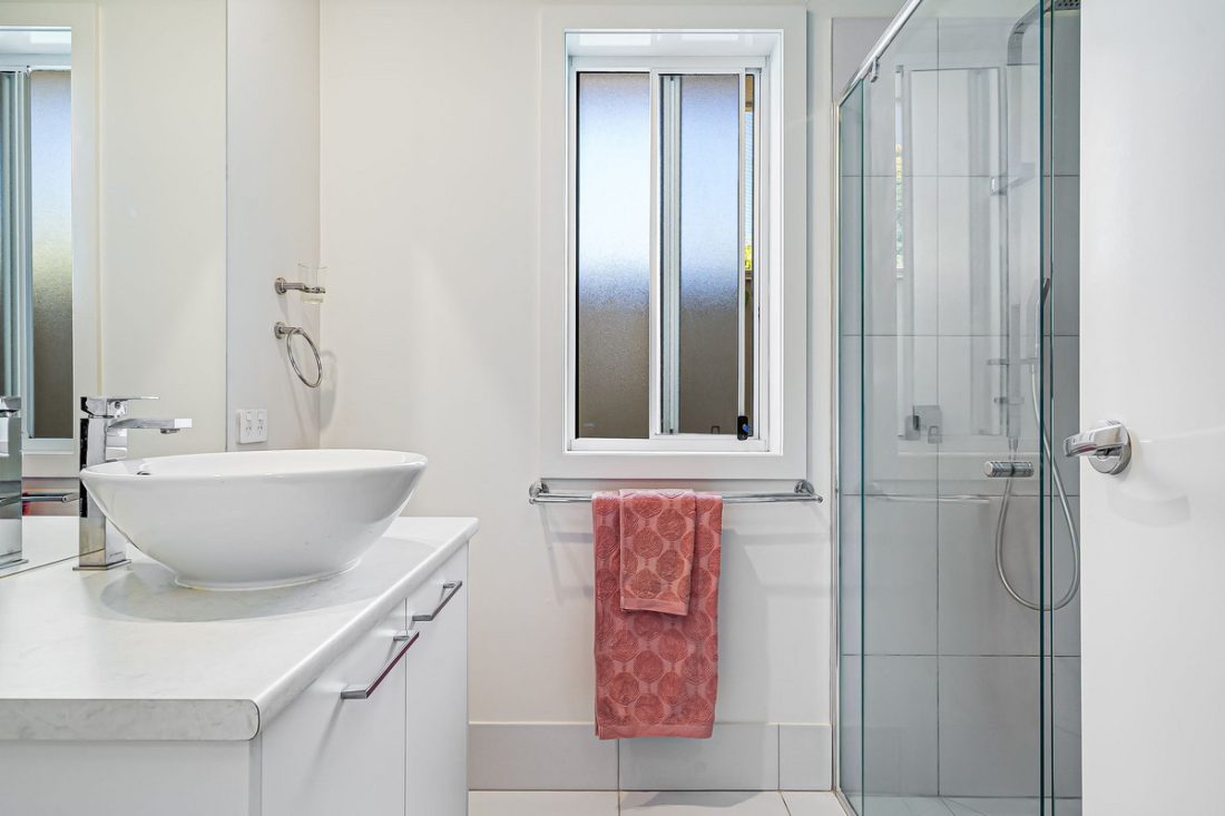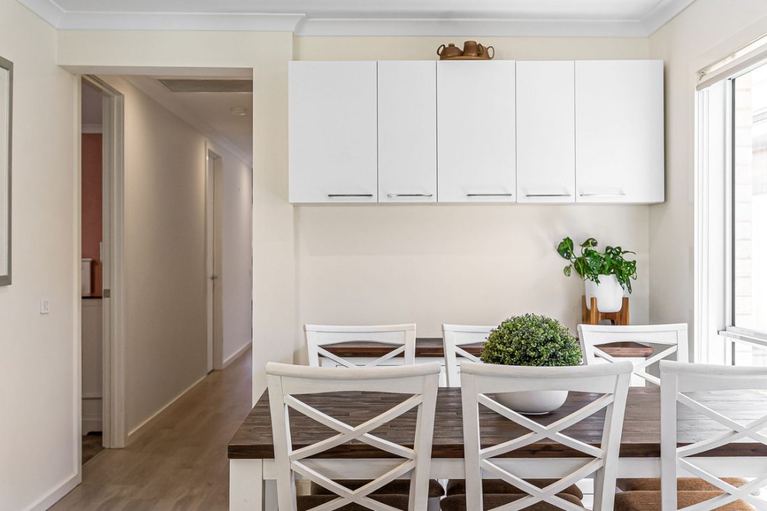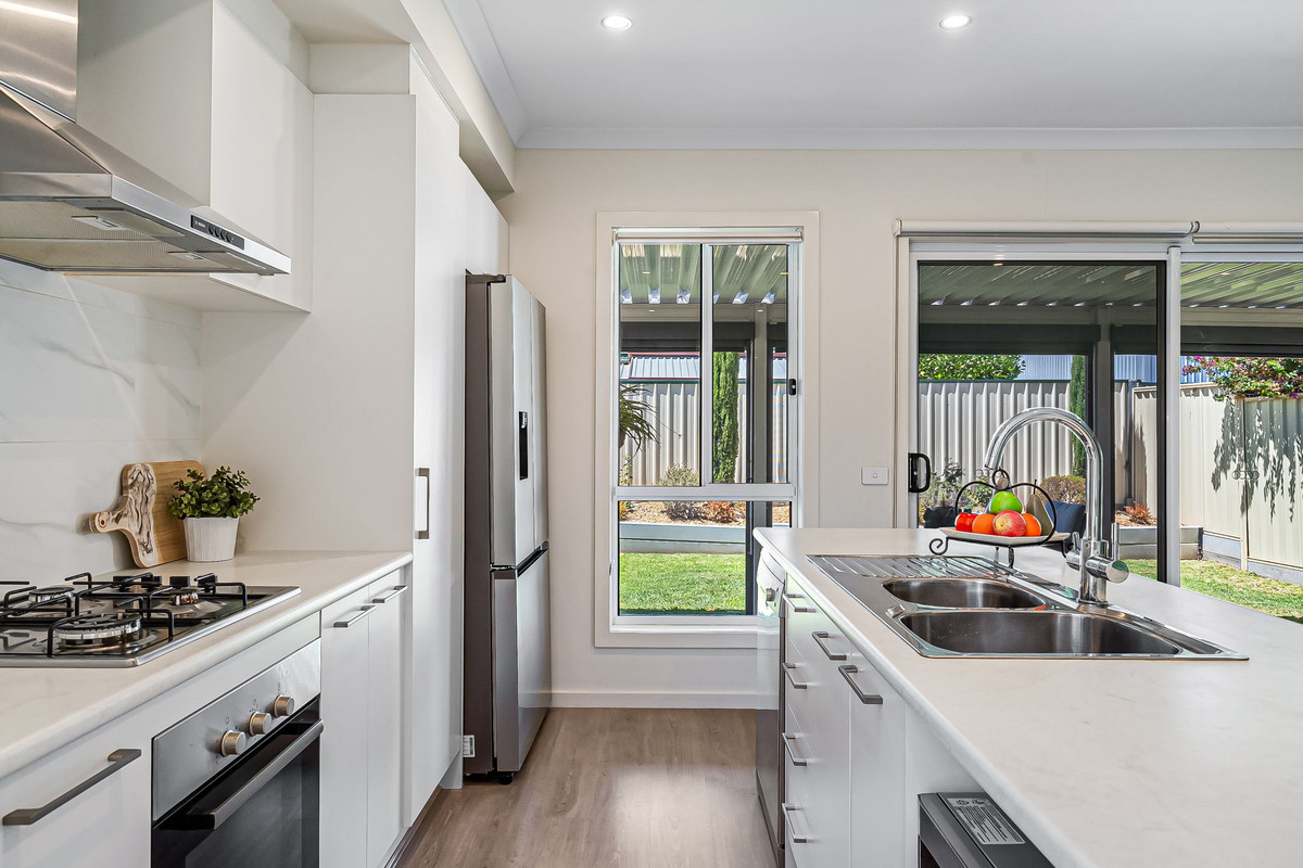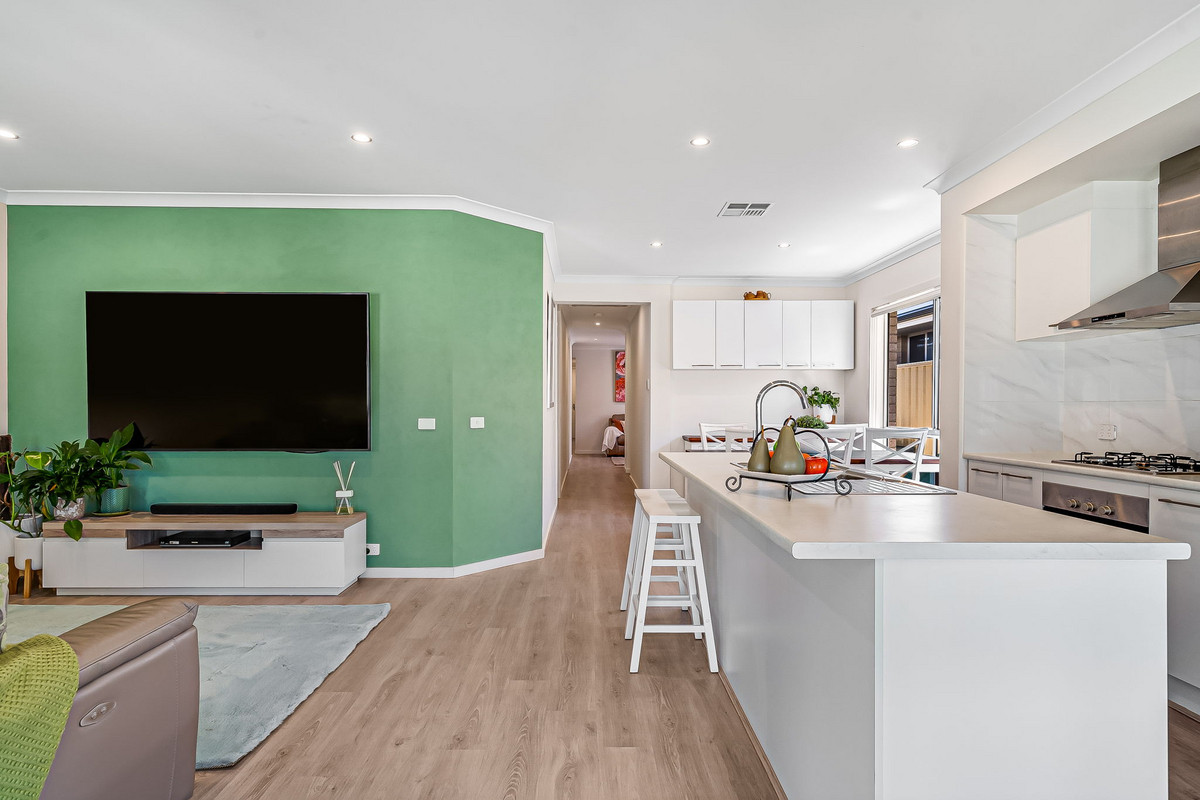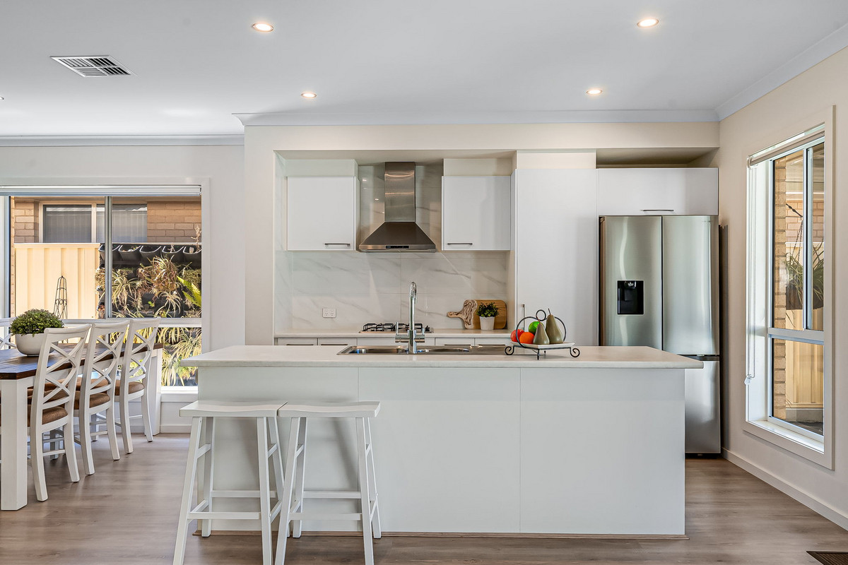 At the heart of the home, the spacious kitchen, living, and dining area combine to creating a warm and welcoming atmosphere. The kitchen boasts crisp white cabinetry, a stylish tiled backsplash, an island bench with bar seating, and sleek stainless steel appliances, including a gas cooktop, range hood and dishwasher.