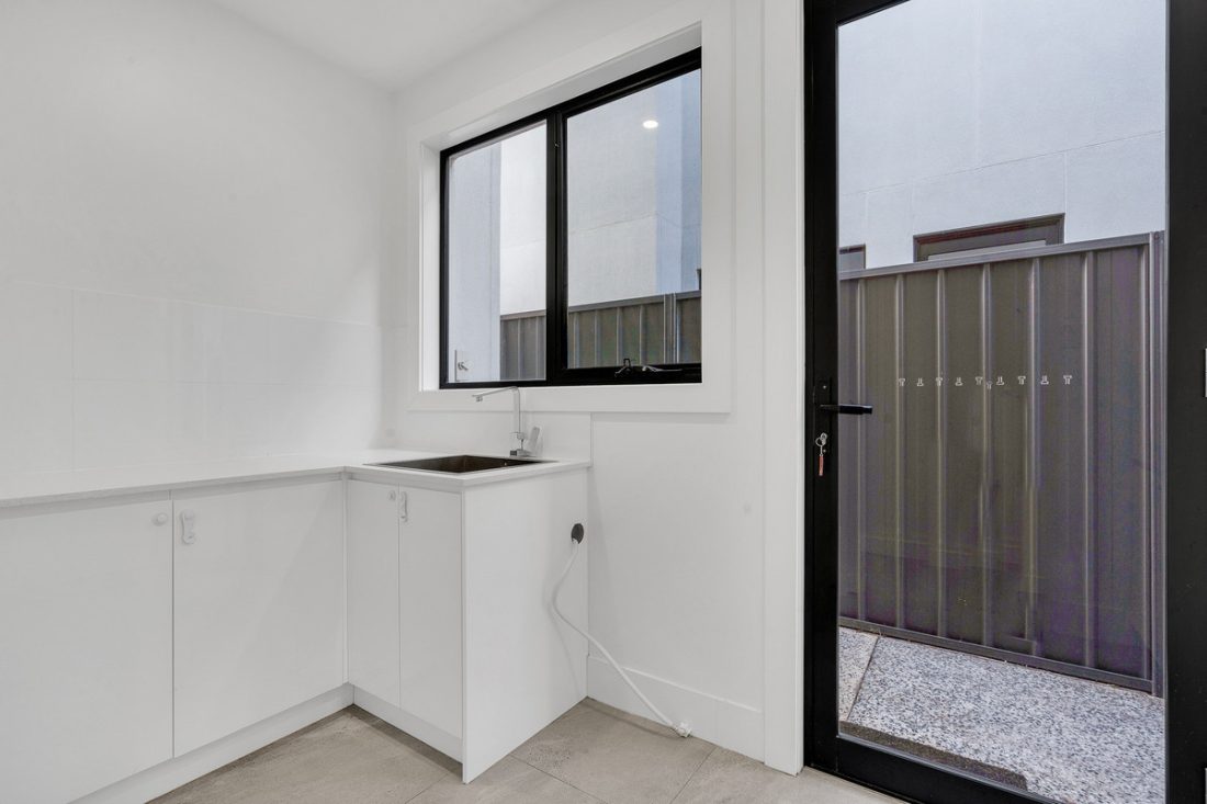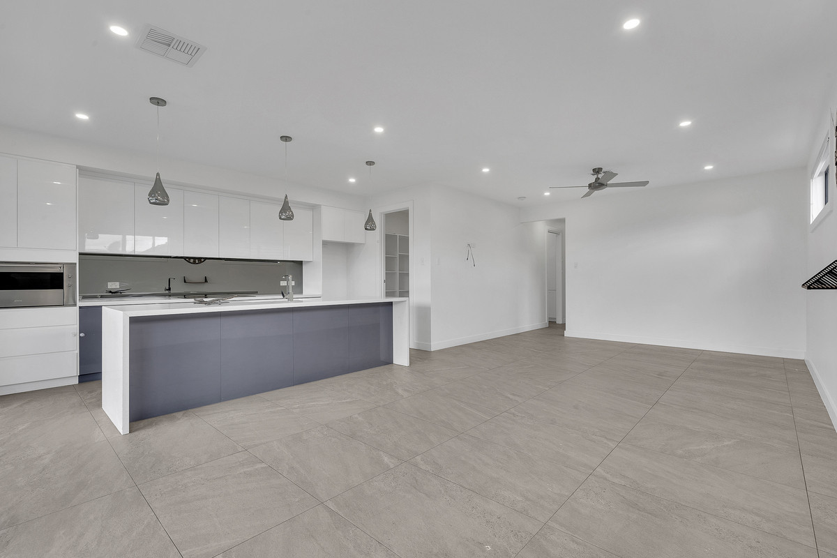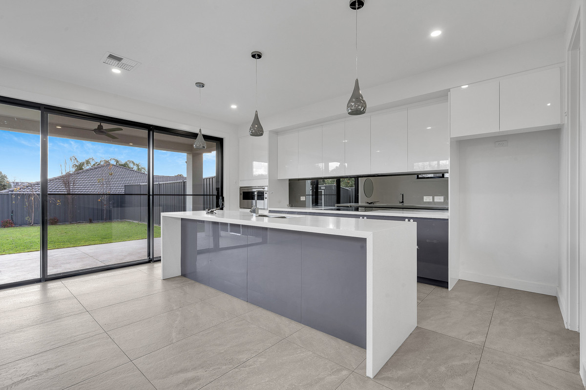 The heart of the home is found in the open-plan living area – this inviting space, adorned with floor tiles and down-lights, is bathed in natural light, setting the perfect scene for daily relaxation and entertaining. The stunning modern kitchen boasts sleek cabinetry, a walk-in pantry for all your storage needs, and premium stainless steel appliances—including an electric cook-top, electric wall oven, and dishwasher.