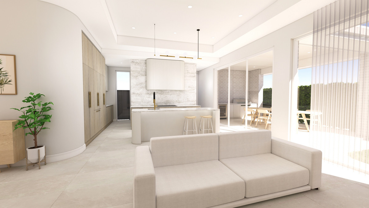 The kitchen flows effortlessly into the open-plan living and dining area, where a travertine tiled fireplace becomes a stunning centrepiece. Floor-to-ceiling sheer curtains soften the space and frame the glass sliding doors that open to a luxurious alfresco zone—complete with a built-in outdoor kitchen, BBQ, bar fridge, and lush landscaping, tailored for year-round entertaining.