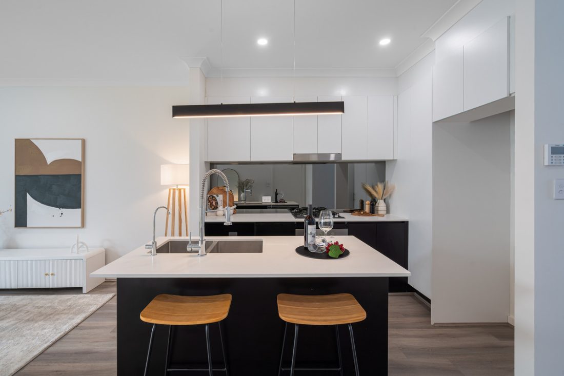 – Stylish kitchen with island bench, double sink, pendant lighting and gas cooktop