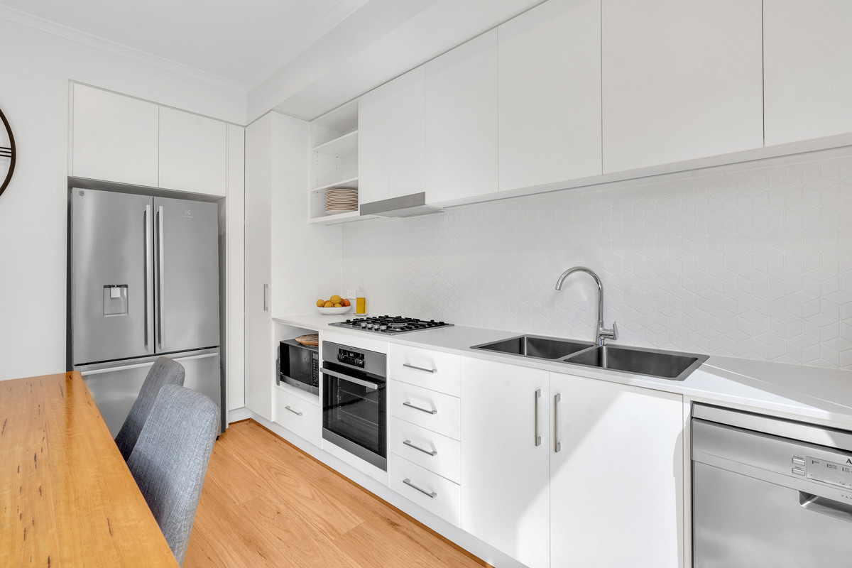 – A sleek, fully equipped kitchen featuring stainless steel appliances, a gas cooktop, and ample storage, making meal preparation effortless